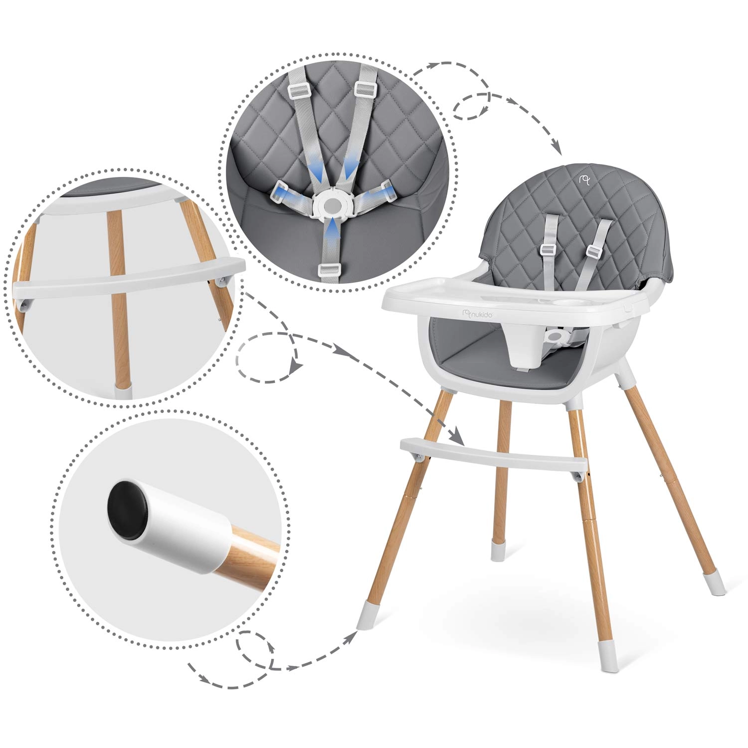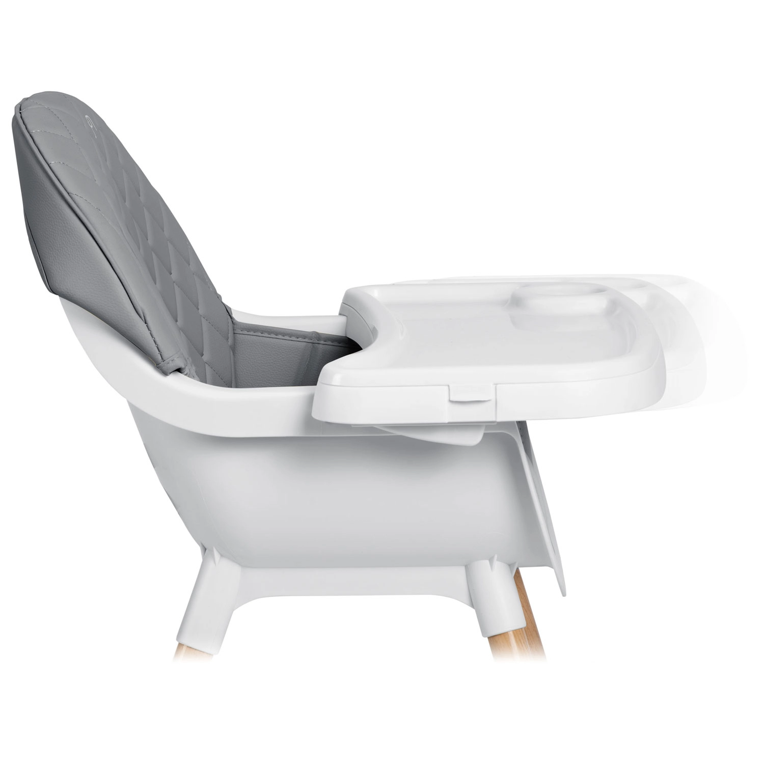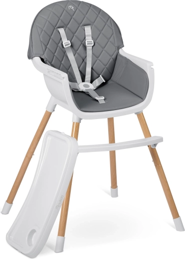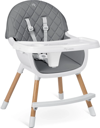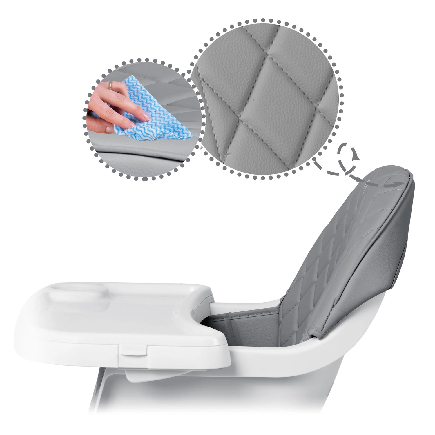 Tăvița reglabilă și detașabilă, suportul solid pentru picioare și construcția stabilă permit utilizarea ca scaun înalt sau fotoliu mai jos. Ideal pentru hrănire, desen, construit cu cuburi și citit.