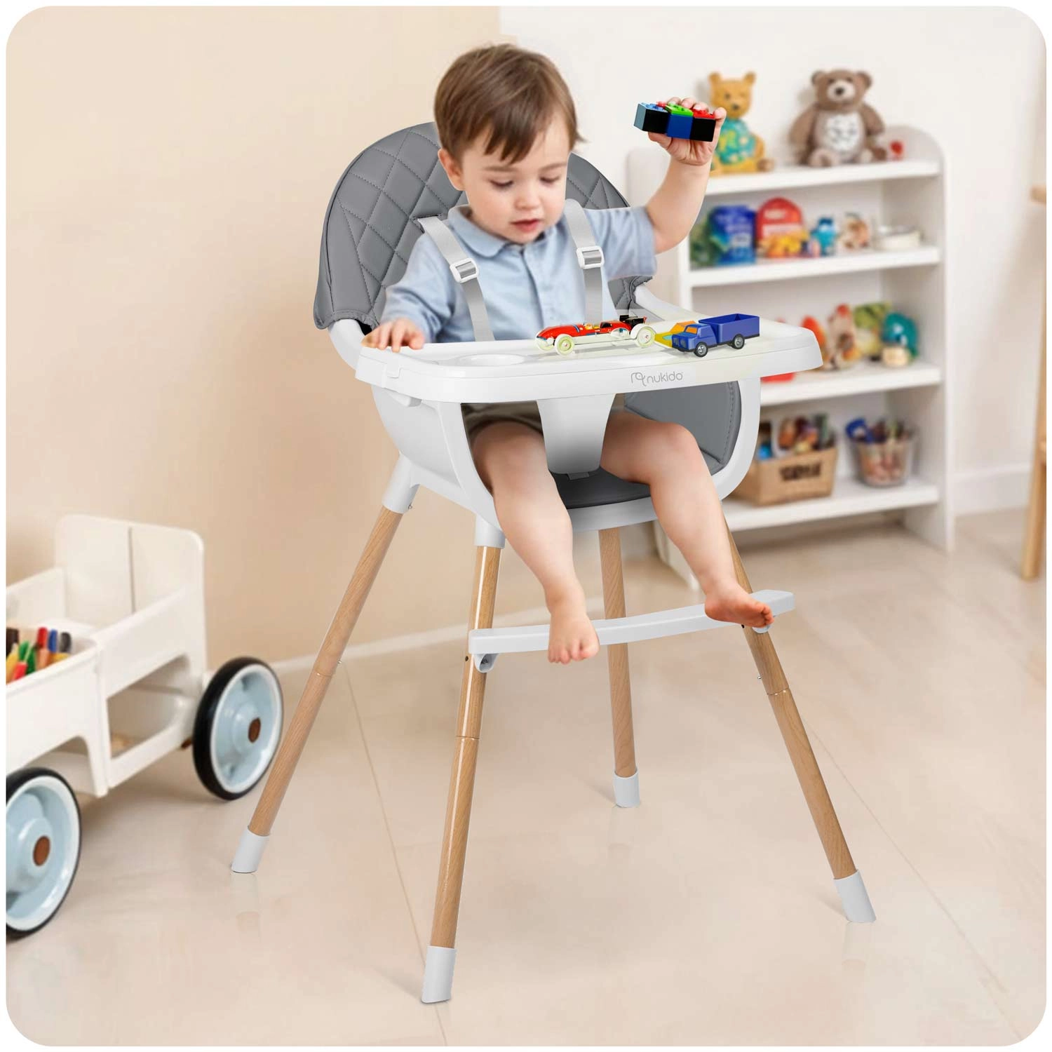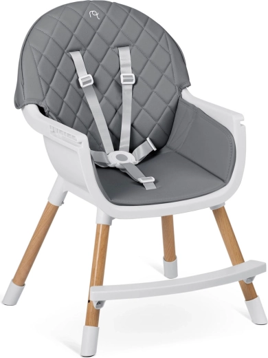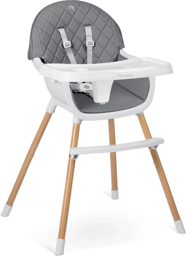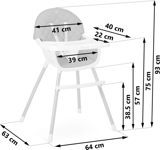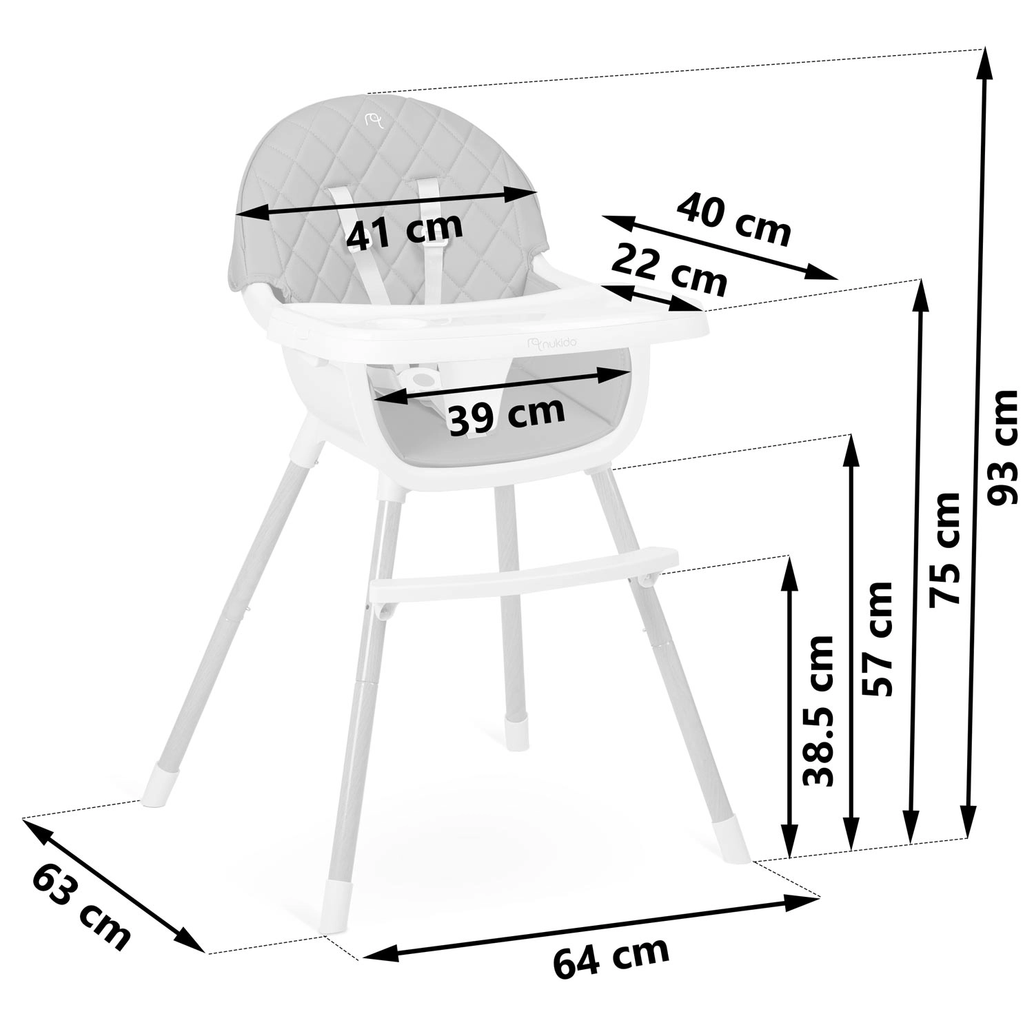 Tăvița reglabilă și detașabilă, suportul solid pentru picioare și construcția stabilă permit utilizarea ca scaun înalt sau fotoliu mai jos. Ideal pentru hrănire, desen, construit cu cuburi și citit.