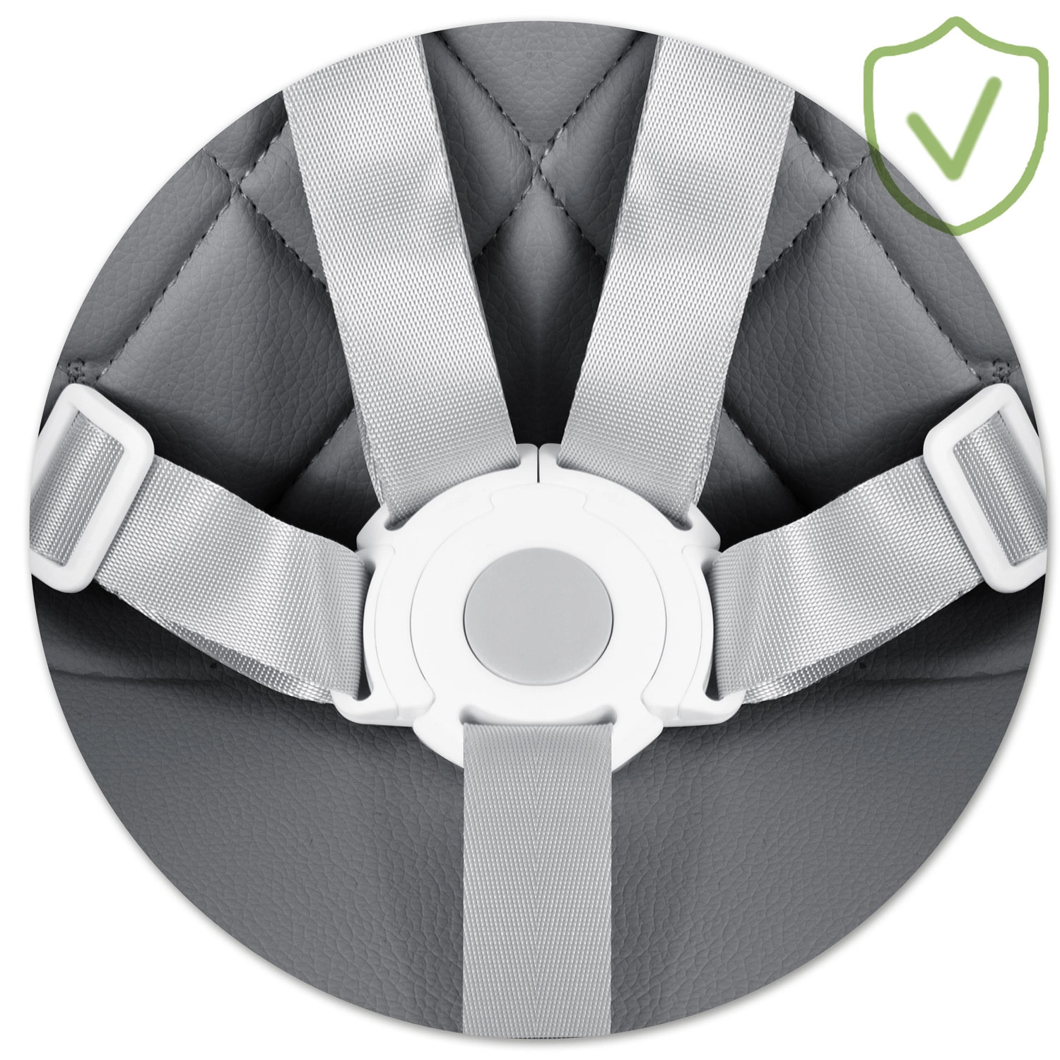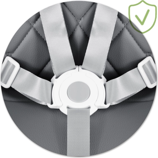 Centurile integrate în 5 puncte fixează copilul ferm și confortabil în scăunel, împiedicând alunecarea accidentală. Scăunelul respectă strictul standard european EN 14988 pentru liniște maximă la fiecare masă și joacă.