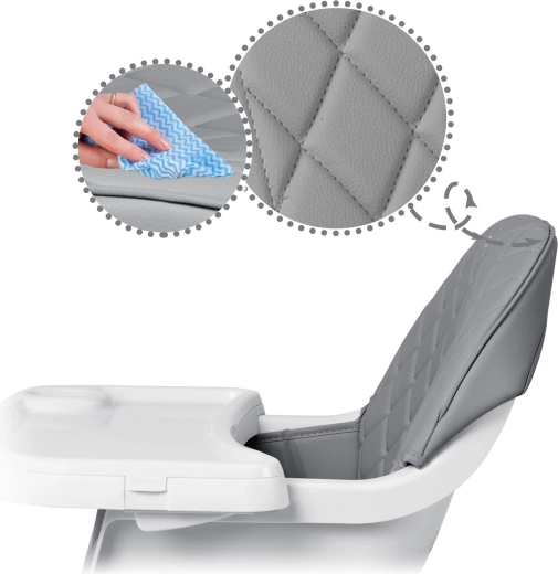 Tăvița cu margini înălțate și inserție superioară separată reține murdăria. După masă o detașați ușor și o clătiți sau o puneți în mașina de spălat vase. Husa cu suprafață impermeabilă se șterge simplu cu o cârpă.