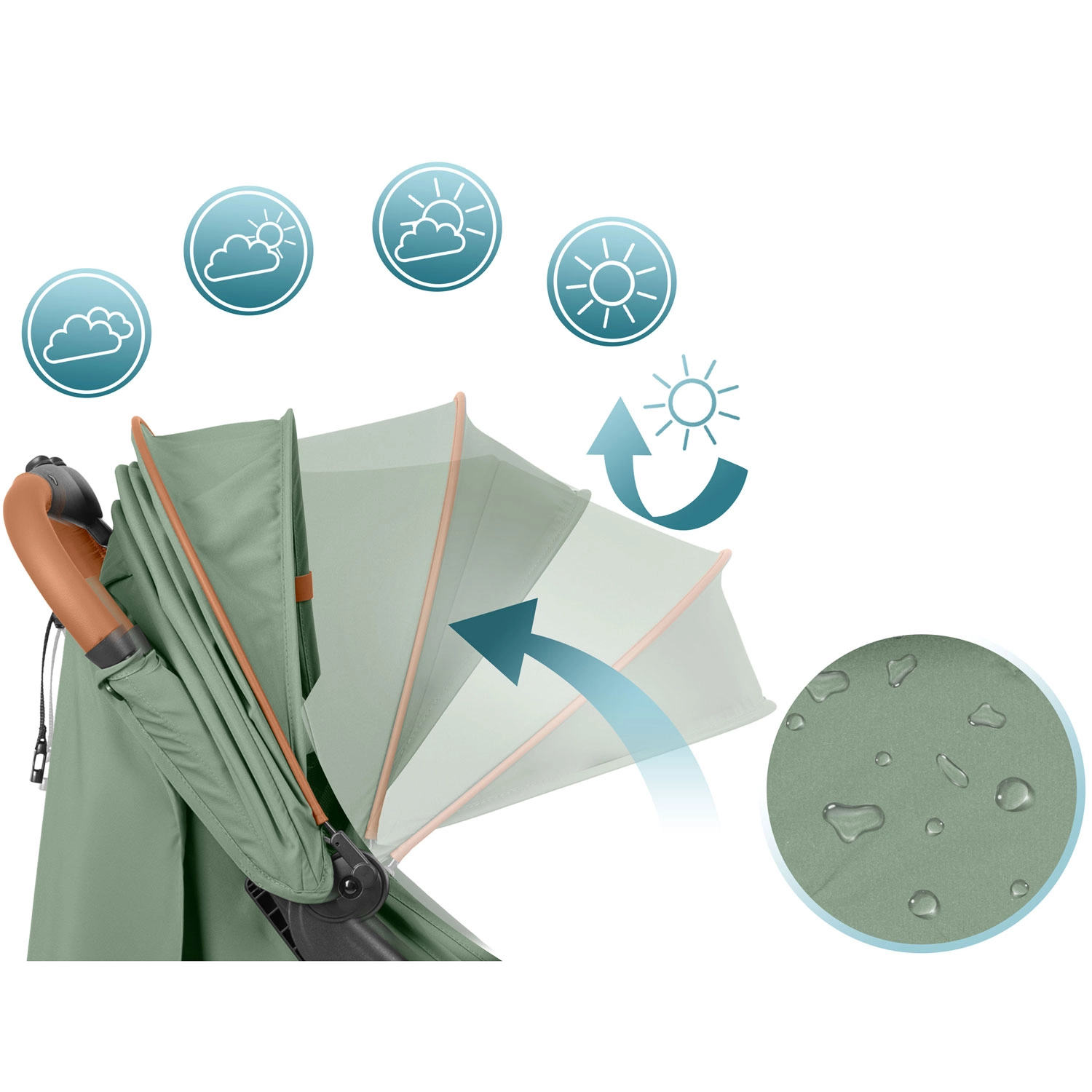 Canopy-ul extensibil, cu mai multe poziții, protejează de soare, vânt și ploaie ușoară. Material hidrofug și umbrire variabilă pentru somn sau observarea împrejurimilor.