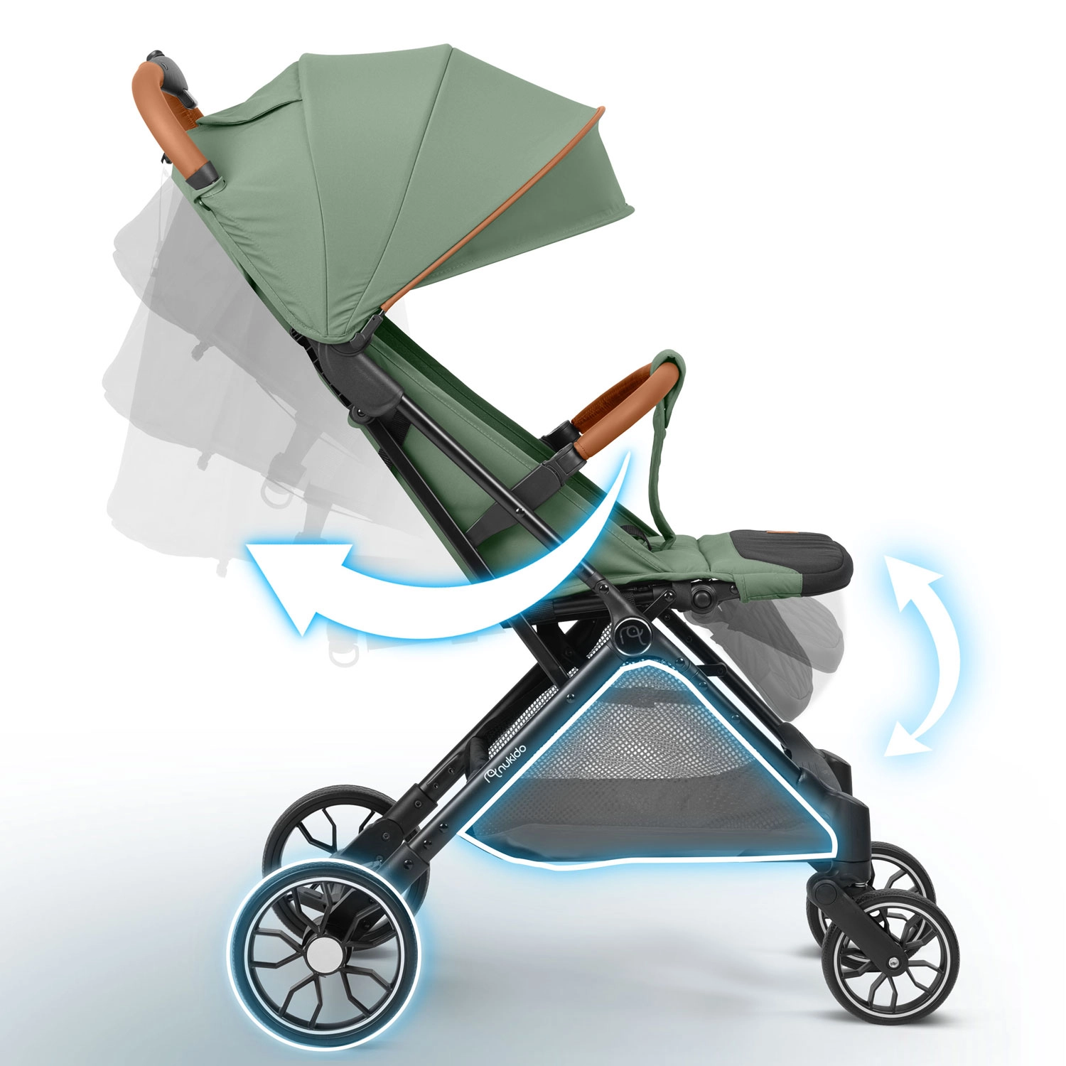 Nukido Paseo combină confortul, siguranța și practicitatea într-un design elegant. Datorită cadrului rezistent și ușor se manevrează ușor, în timp ce roțile frontale pivotante 360° cu amortizare și roțile spate mai mari pentru teren variat asigură o deplasare lină atât în oraș, cât și în parc. Copilul este protejat de centura în 5 puncte cu bureți și de copertina extensibilă cu protecție împotriva soarelui și a ploii ușoare.