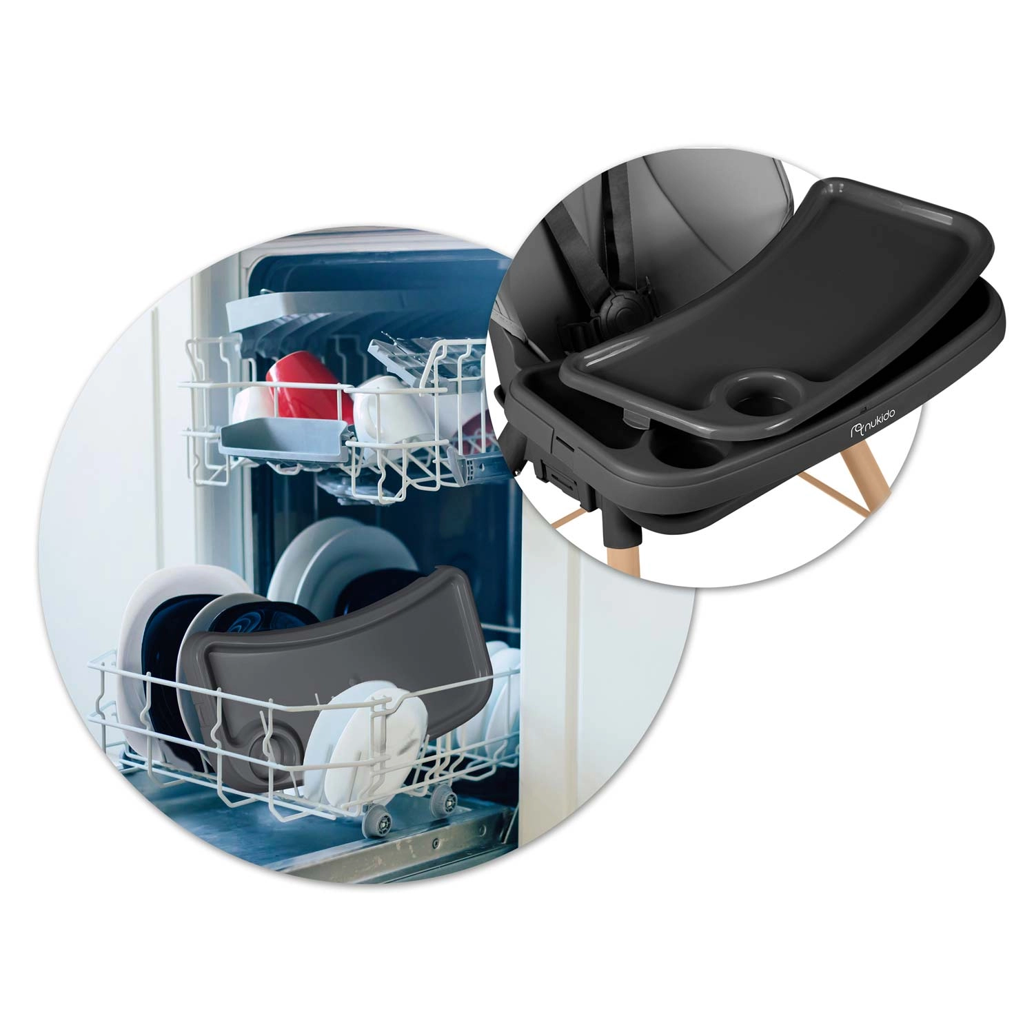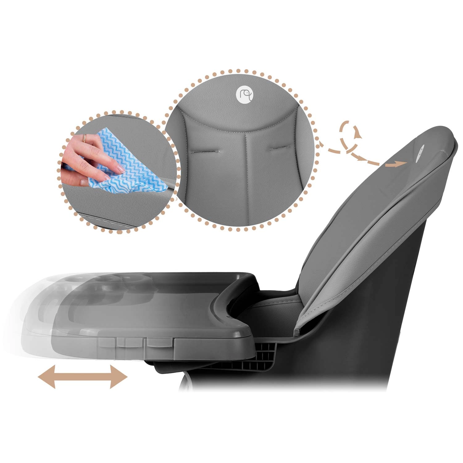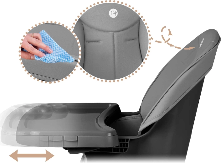 Tăvița principală este glisantă și complet detașabilă – cu inserție practică și margini înălțate împotriva vărsărilor. Suprafețele se șterg ușor cu o cârpă umedă, iar tăvița și inserția pot fi spălate în mașina de vase. Pentru siguranță maximă, ai centură în 5 puncte și suport solid pentru picioare. Scăunelul respectă standardul european strict EN 14988.