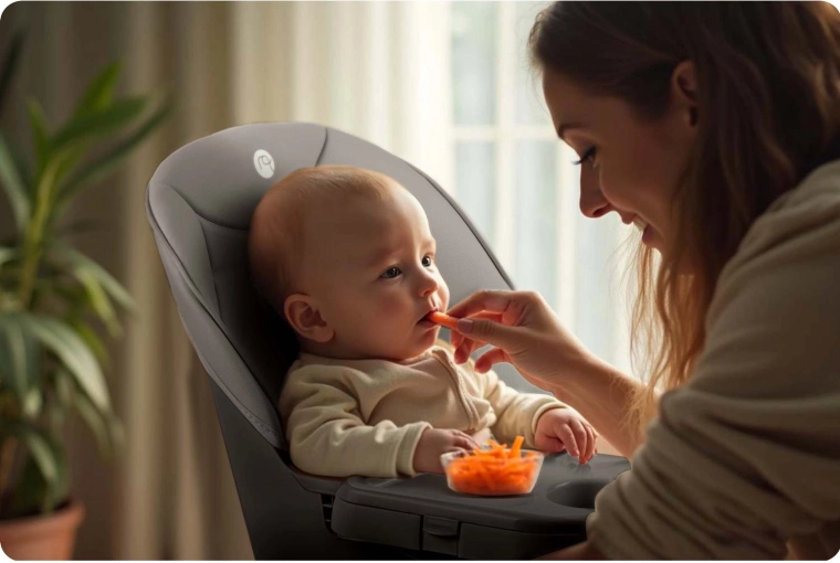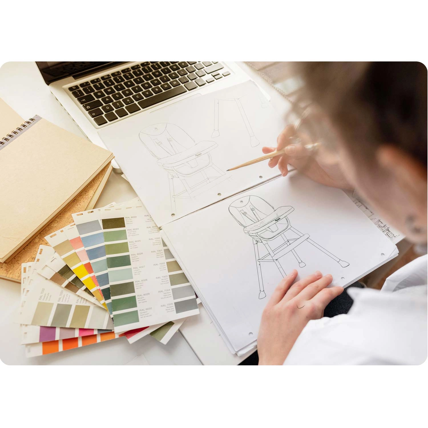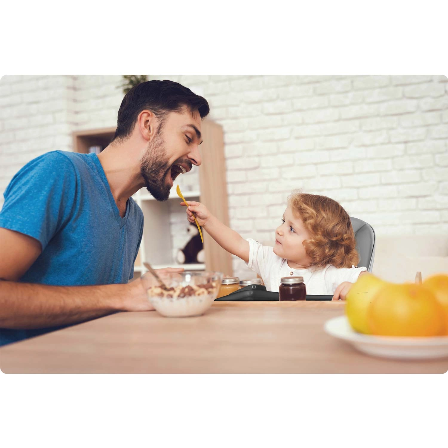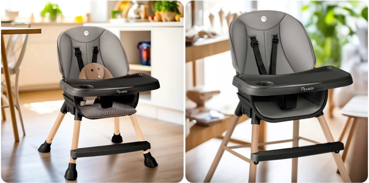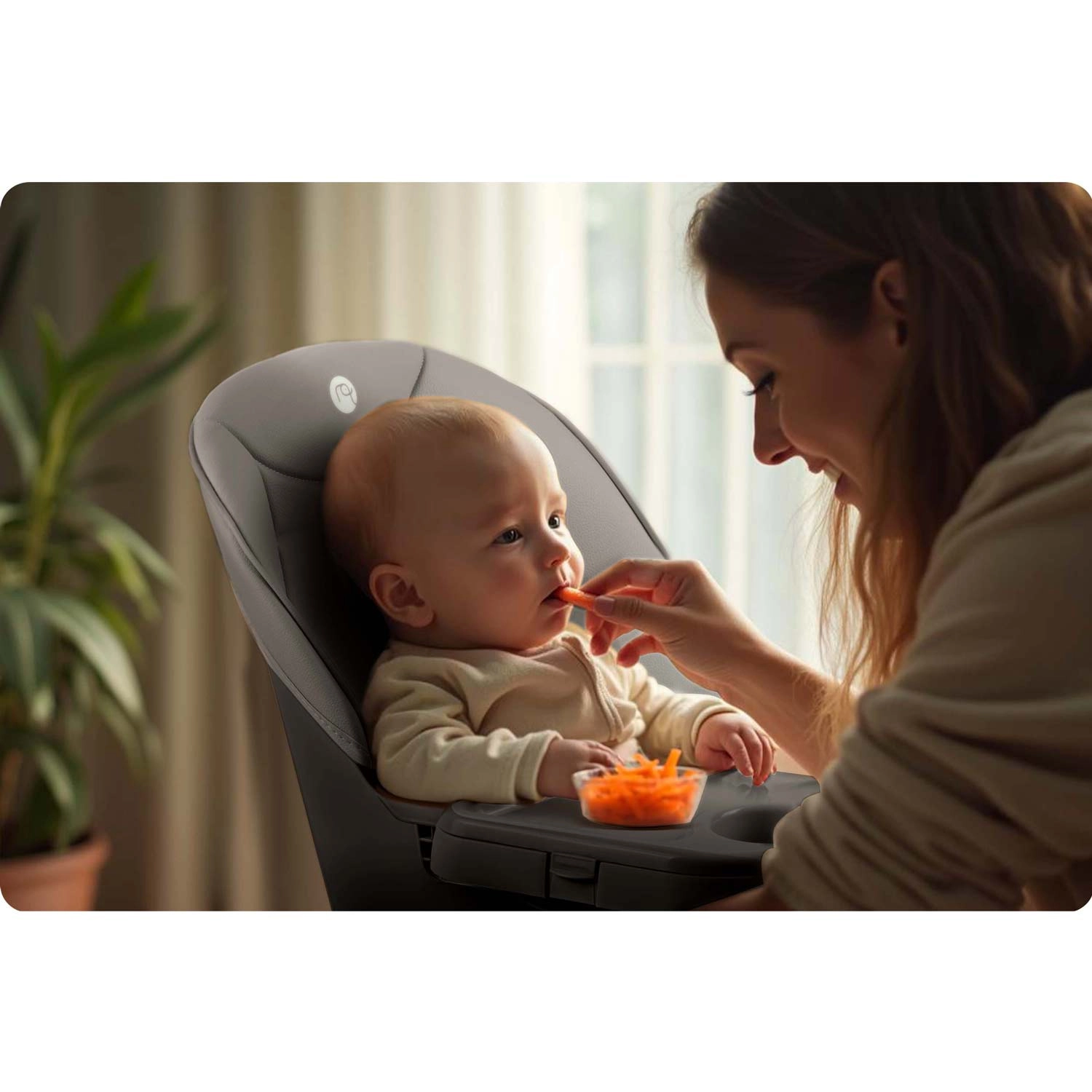Comută între scaun înalt pentru masă, fotoliu jos cu tăviț și scăunel separat pentru joacă și citit. Ideal de la primele piureuri până în perioada de toddler.