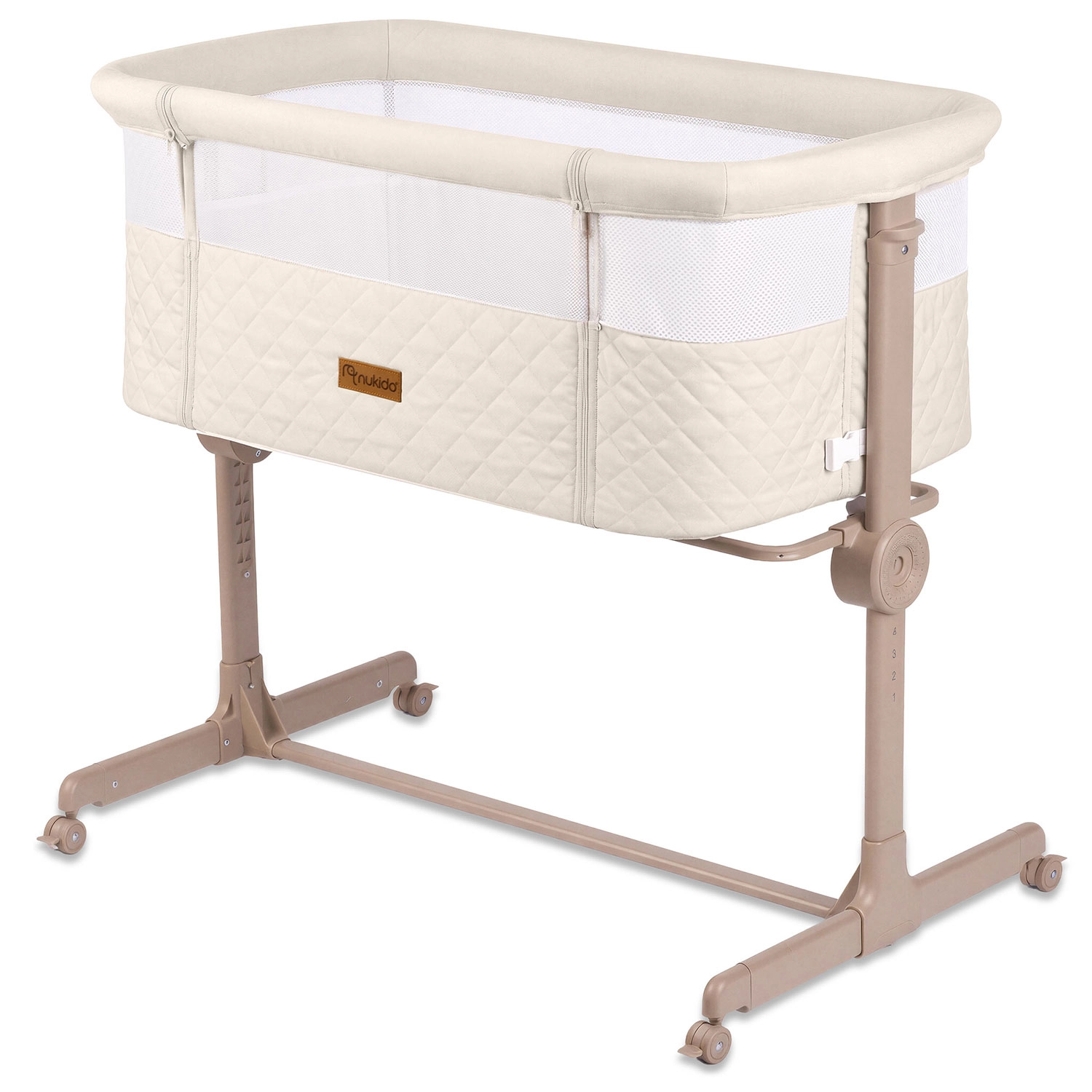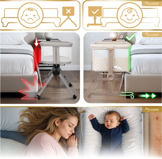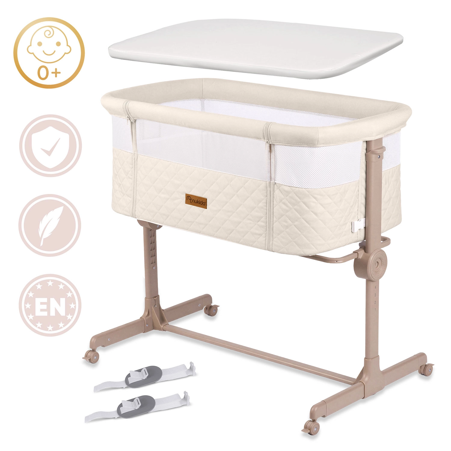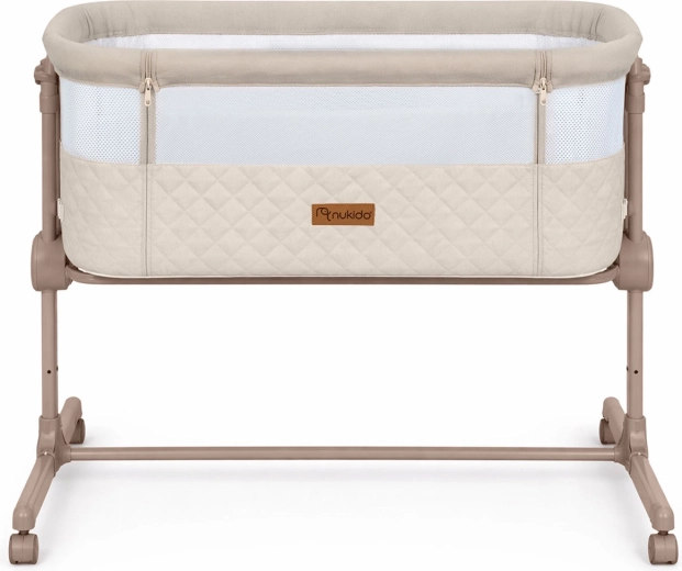 Pătuțul lateral NUKIDO pentru nou-născuți este practic și sigur, oferind 7 niveluri de reglare a înălțimii, înclinare independentă a ambelor părți pentru confort chiar și în caz de reflux, panou lateral detașabil cu fermoar pentru acces ușor pe timp de noapte și 4 roți cu frâne pentru mobilitate în casă. Include saltea cu husă lavabilă și curele pentru fixare sigură de patul părinților.