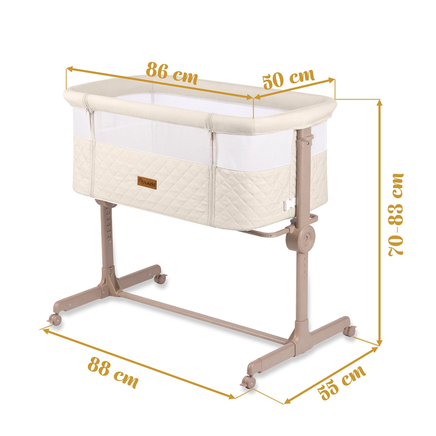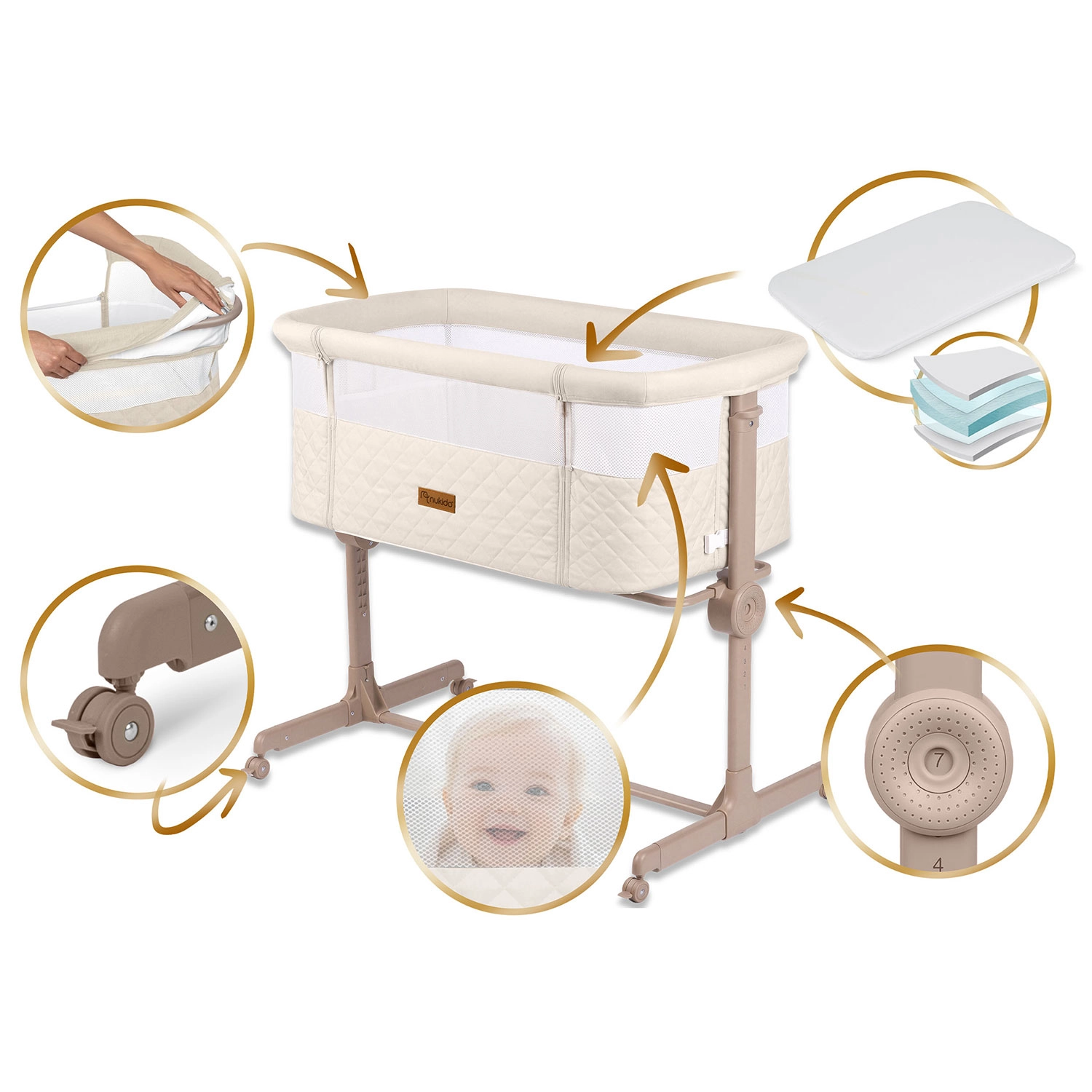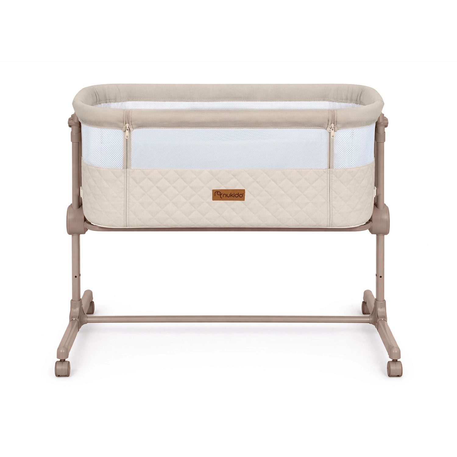 Pătuțul lateral NUKIDO pentru nou-născuți este practic și sigur, oferind 7 niveluri de reglare a înălțimii, înclinare independentă a ambelor părți pentru confort chiar și în caz de reflux, panou lateral detașabil cu fermoar pentru acces ușor pe timp de noapte și 4 roți cu frâne pentru mobilitate în casă. Include saltea cu husă lavabilă și curele pentru fixare sigură de patul părinților.