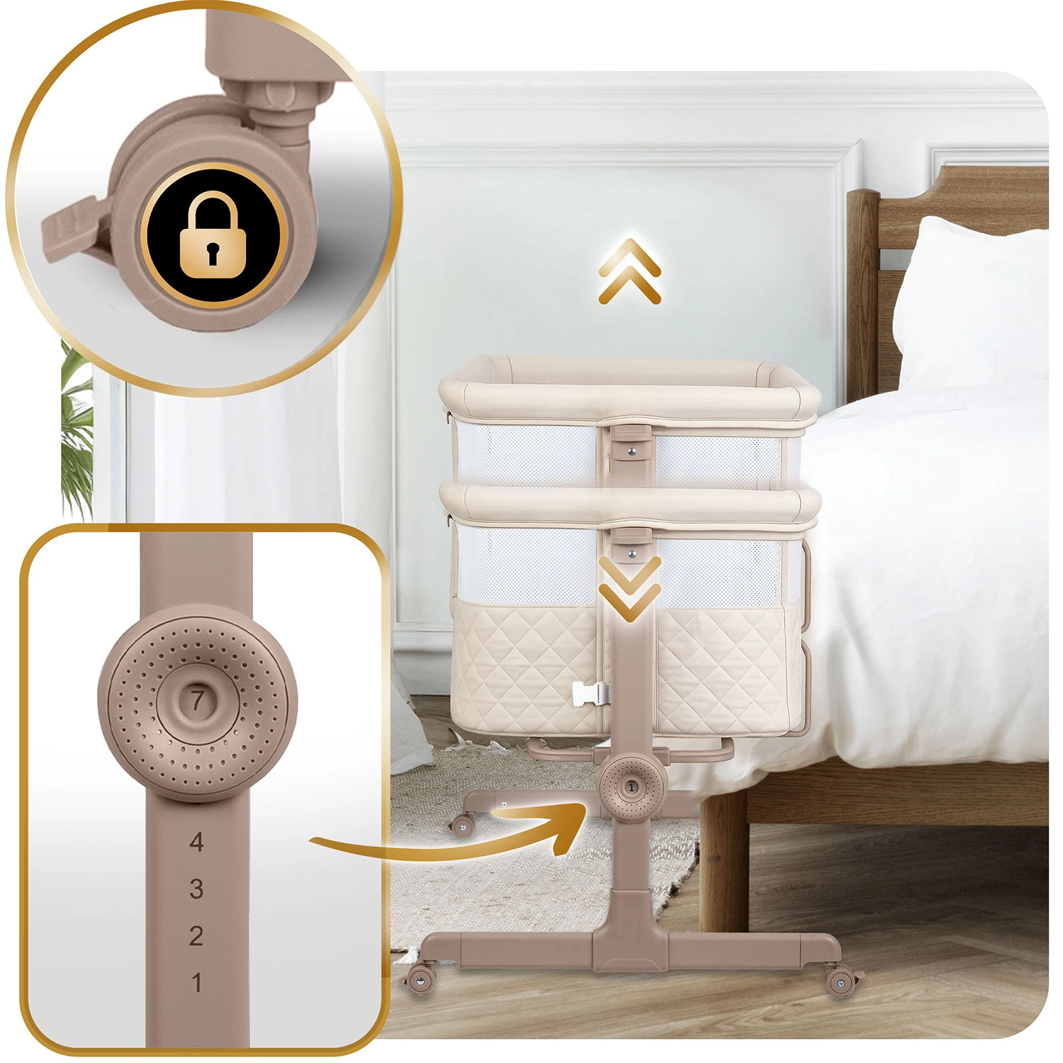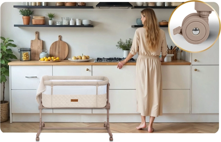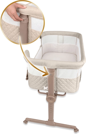 Fiecare latură poate fi reglată separat – aliniază ușor pătuțul cu patul părinților sau înclină-l delicat pentru mai mult confort pentru bebeluș și ameliorarea refluxului.