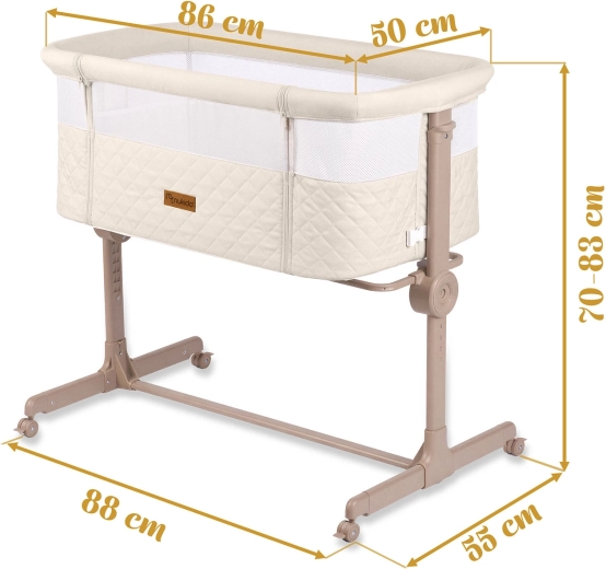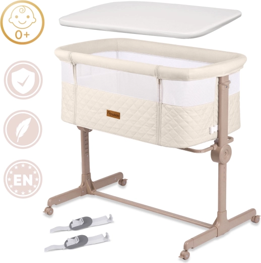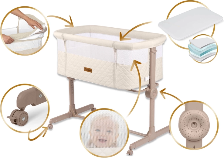- Apropiere sigură – fixare de pat cu curele și laterală care se deschide cu fermoar pentru alăptare pe timp de noapte.