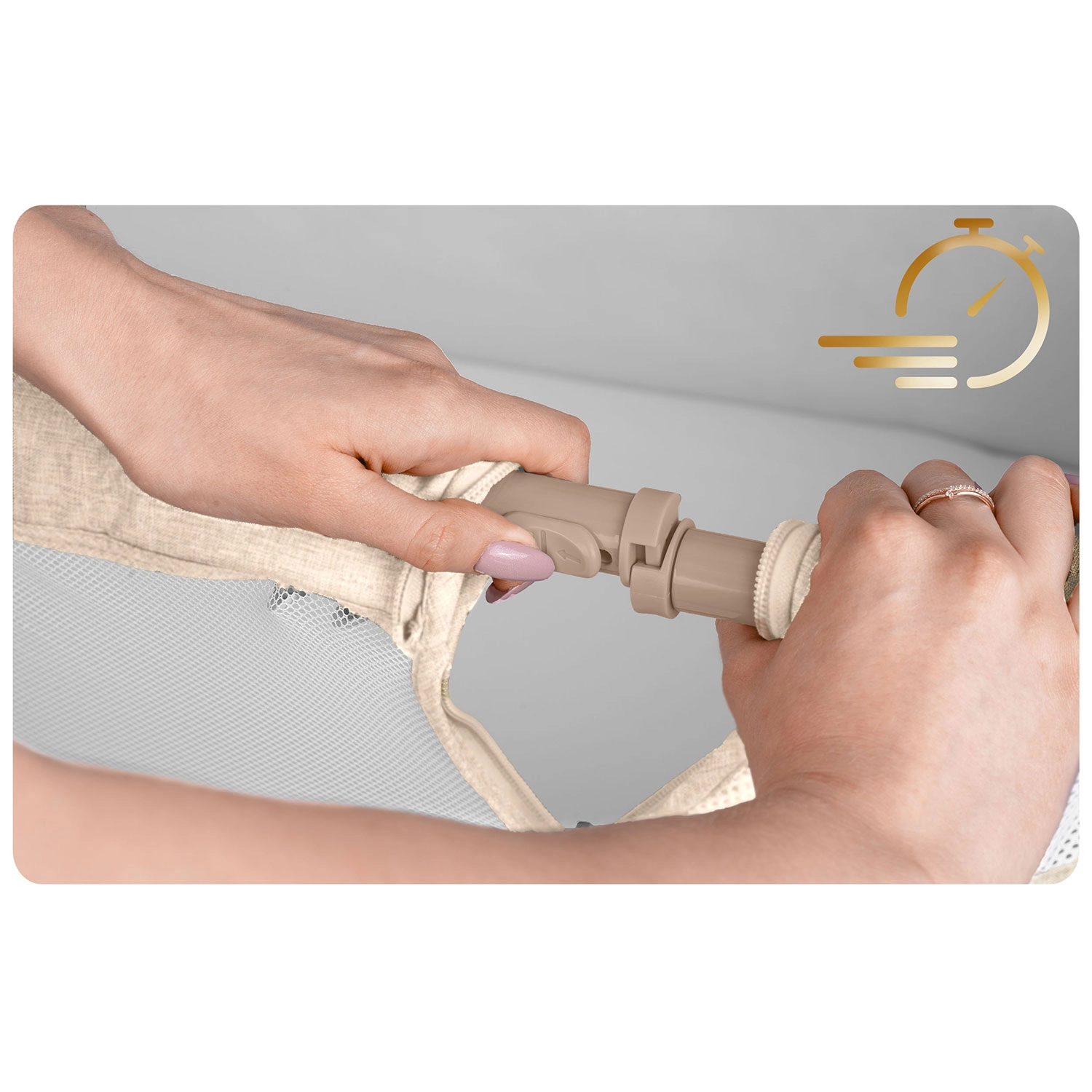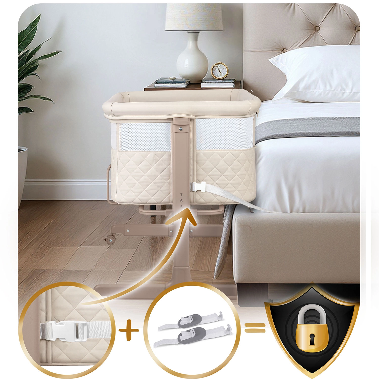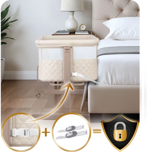 Panoul lateral cu fermoar se deschide spre exterior, astfel încât copilul să nu îl poată deschide. Curelele de fixare conectează ferm pătuțul de patul părinților pentru stabilitate maximă.