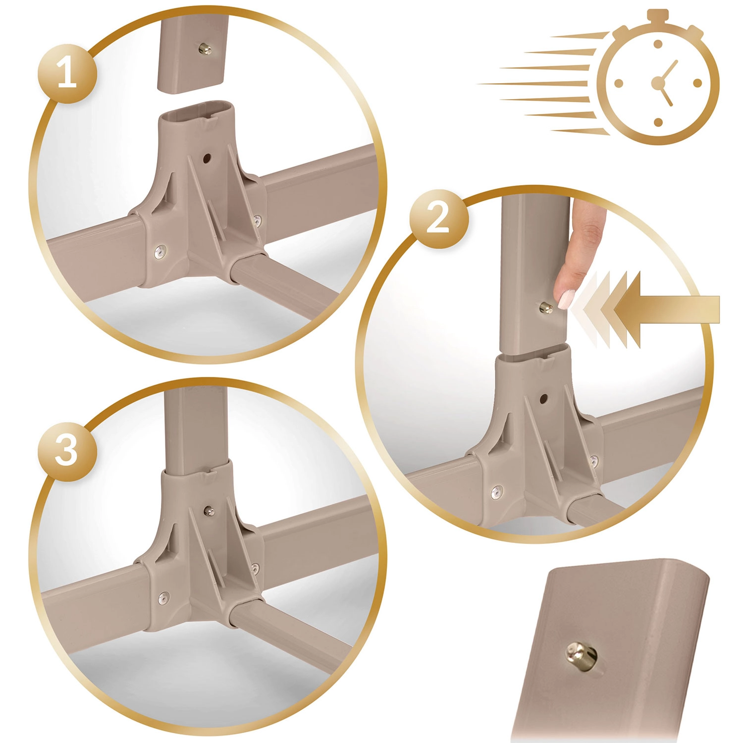 Sistemul Quick Click permite asamblare fulger fără unelte. Husele pot fi îndepărtate și spălate, iar salteaua are husă detașabilă și respirabilă.