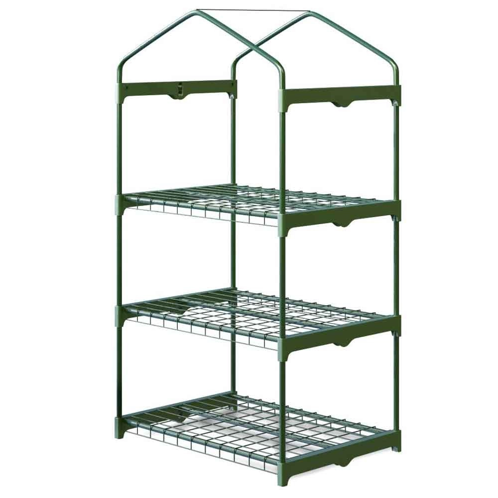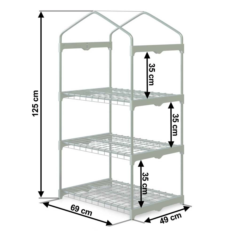 Configurația pe trei etaje, cu distanță între rafturi de 35 cm, economisește spațiu și găzduiește răsaduri, ierburi aromatice și ghivece mici.