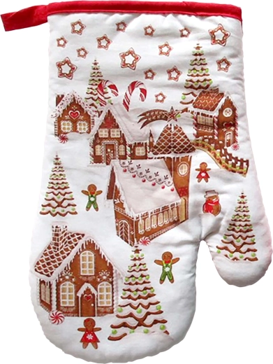 Mănușa de bucătărie TORO, stilată, cu motivul căsuțelor din turtă dulce, protejează mâinile de căldură și abur datorită căptușelii interioare moi și croielii prelungite. Plăcută la atingere, din 100% bumbac, cu agățătoare practică și un design festiv care aduce atmosfera potrivită gătitului și coptului.
