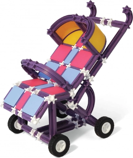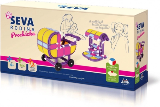 Descoperiți setul creativ de construcție SEVA Rodina – plimbare cu 166 piese în nuanțe frumoase de mov, roz și bleu. Copiii de la 4 ani pot construi un căruț pentru păpuși, o leagăn, o bancă și alte elemente de parc – totul pentru a dezvolta imaginația, motricitatea fină și creativitatea.