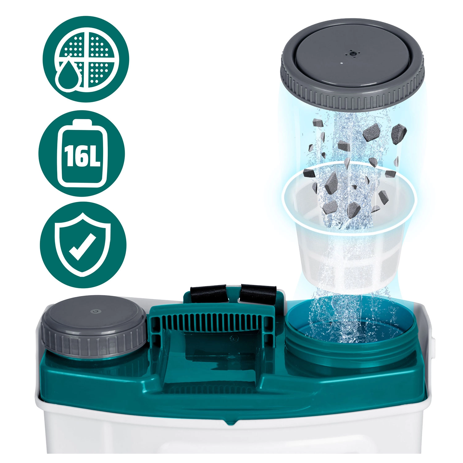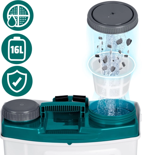 Datorită celor 4 duze interschimbabile alegeți ușor jetul ideal – ceață fină pentru plante sensibile, jet plat pentru lucru precis, duză reglabilă cu patru orificii pentru utilizare universală sau cap dublu pentru acoperirea rapidă a straturilor mai late. Bretlele căptușite și întărite cu reglaj, sita de filtrare împotriva impurităților și rezervorul PE rezistent asigură durabilitate îndelungată și confort la lucru.