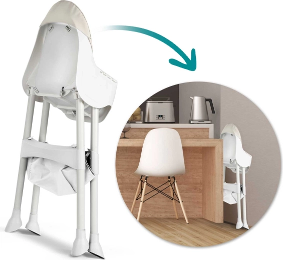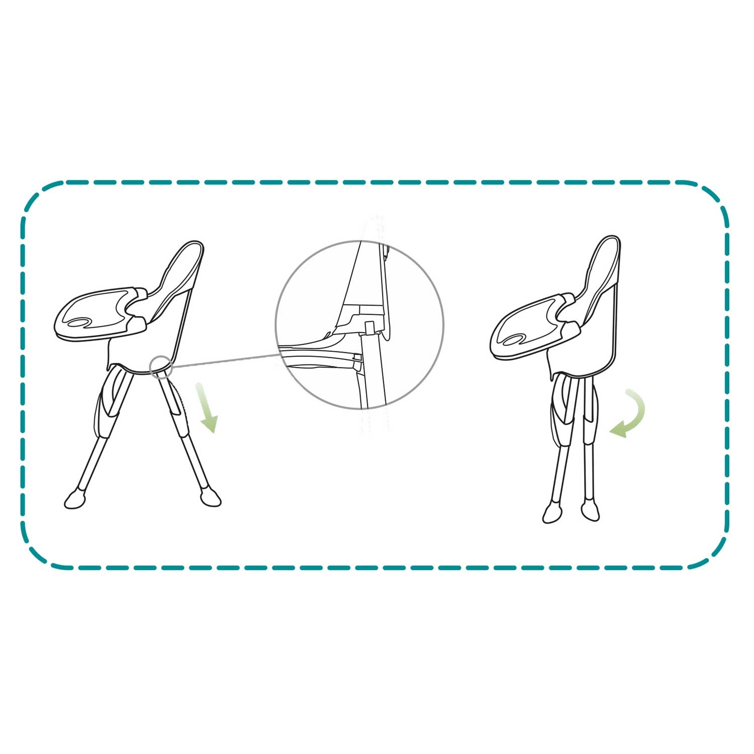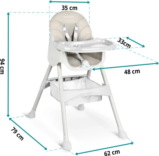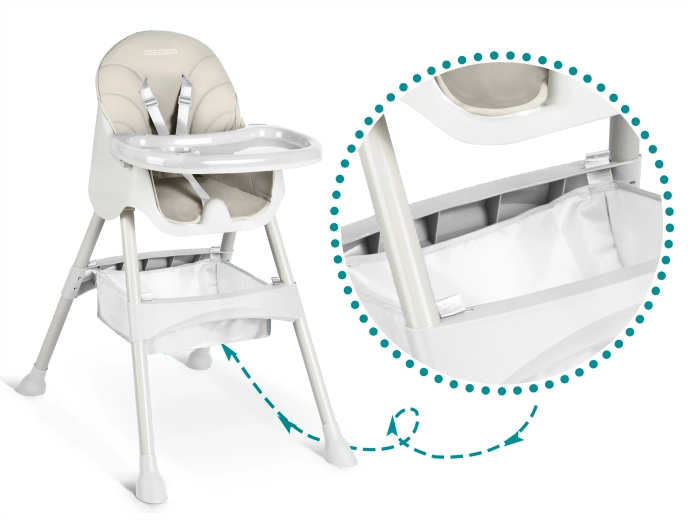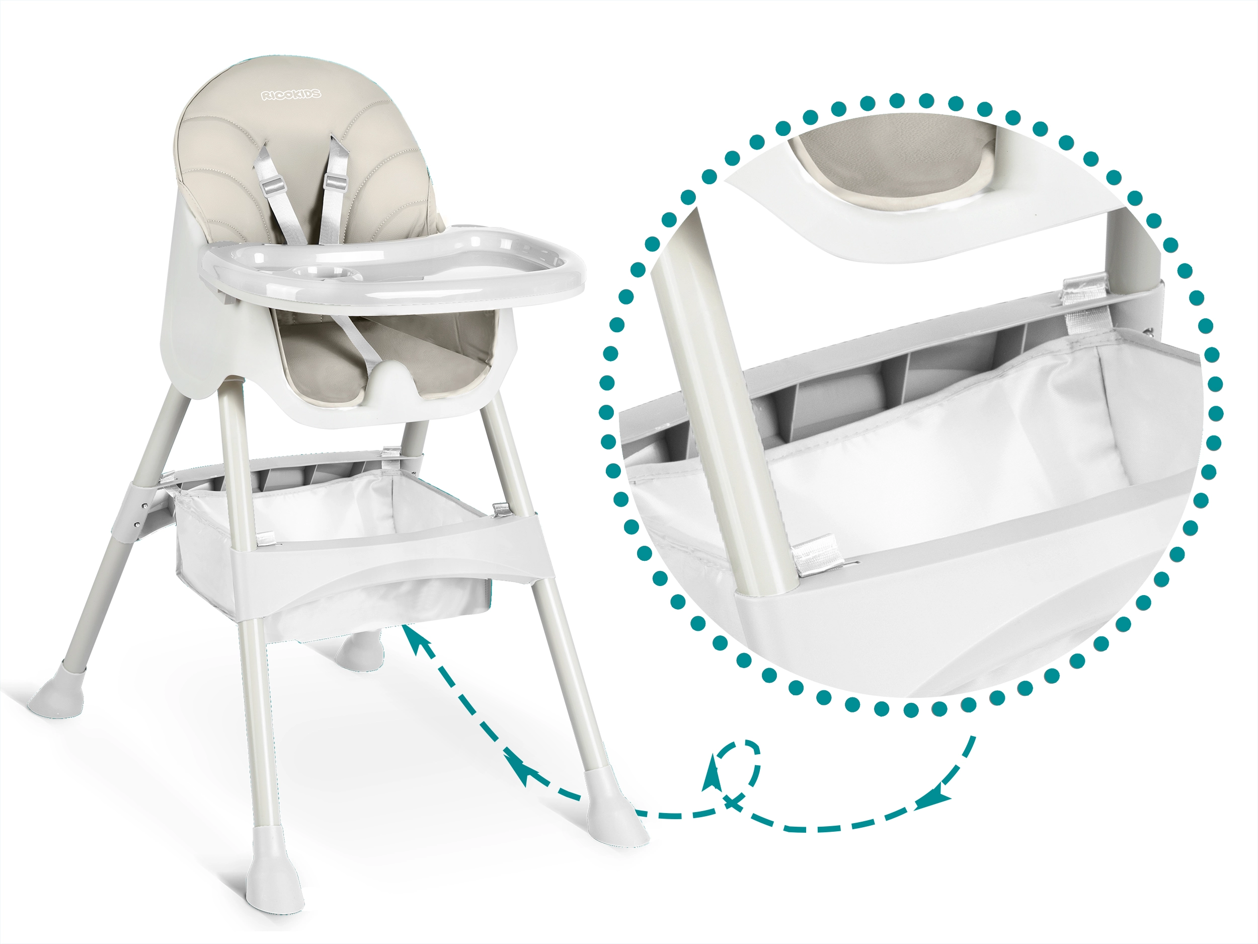 Siguranța este asigurată de centurile fiabile în 5 puncte și de picioarele late antiderapante cu capete din cauciuc pentru stabilitate pe diverse suprafețe. Pliarea practică permite depozitarea compactă, astfel încât scăunelul ocupă minimum de spațiu. În pachet este inclus și un coș rezistent sub șezut, în care puteți pune jucării sau accesorii pentru hrănire.