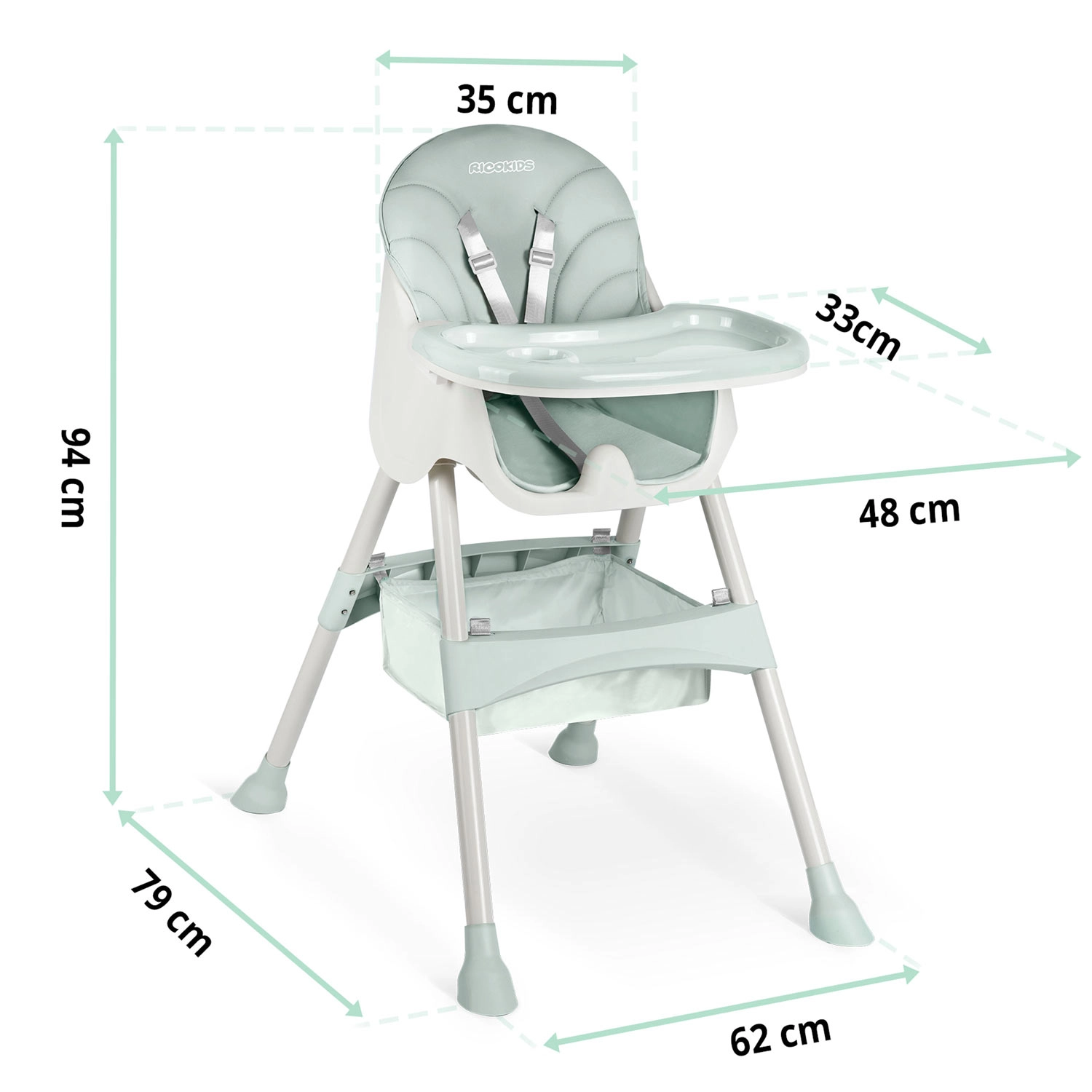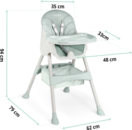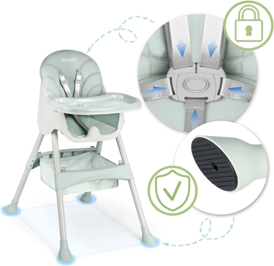 Siguranța este asigurată de centurile în 5 puncte și picioarele antiderapante, care mențin scăunelul stabil pe orice suprafață. Construcția pliabilă economisește spațiu – îl pliezi în câteva clipe și îl depozitezi ușor. În pachet este inclus și un coș practic pentru jucării și mărunțișuri, ca să ai mereu totul la îndemână.