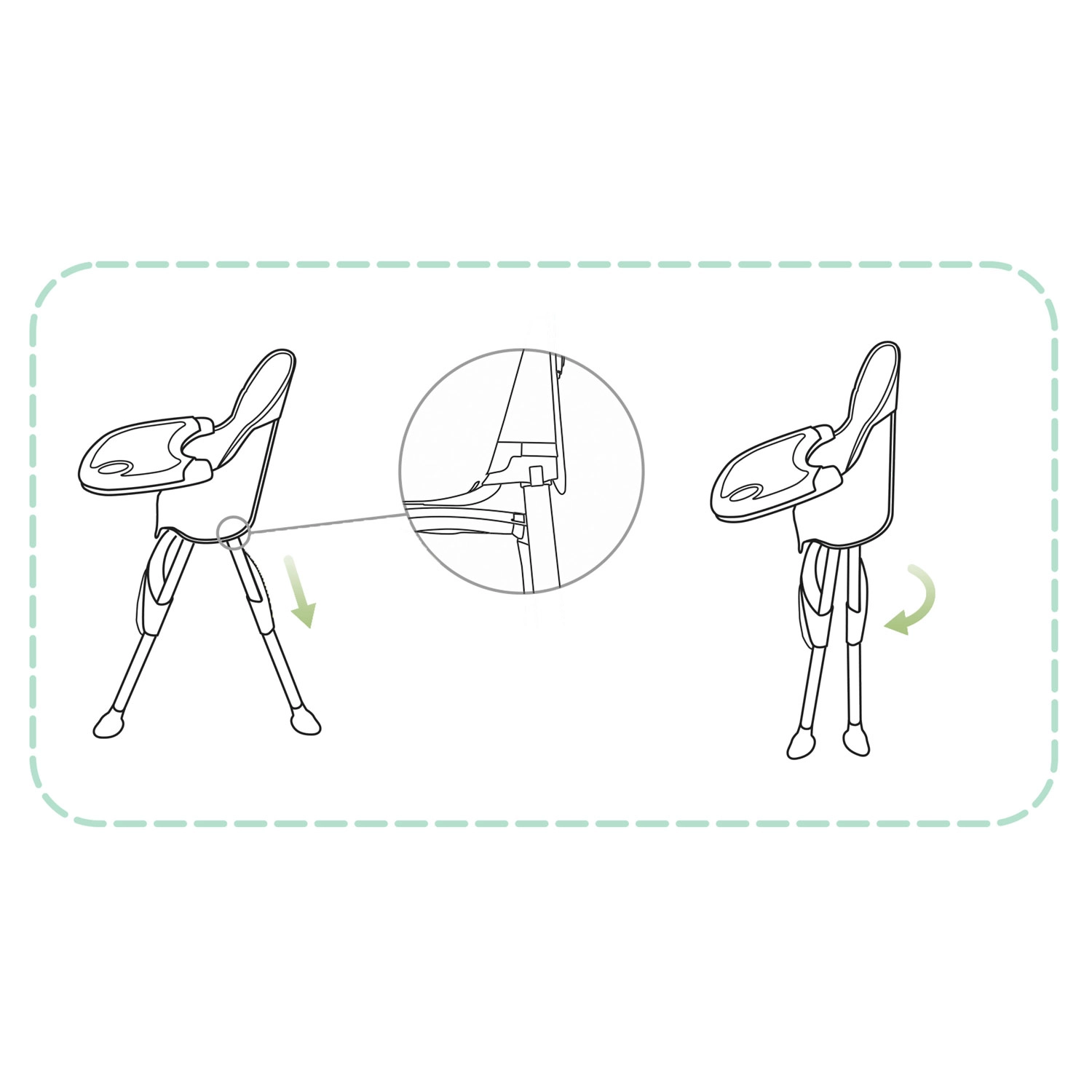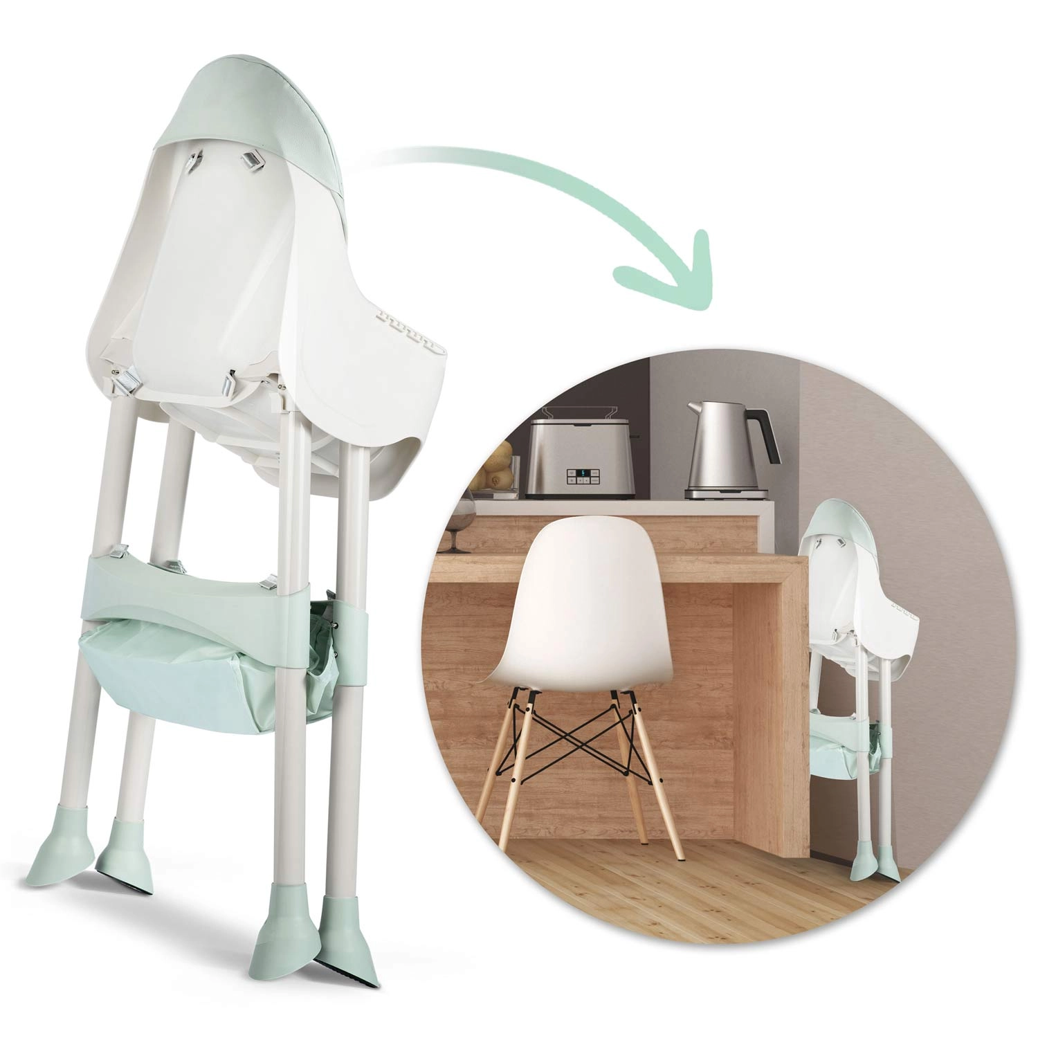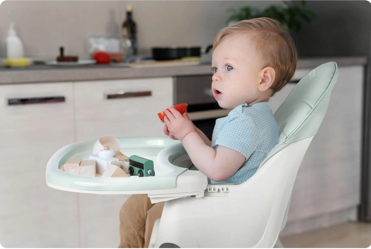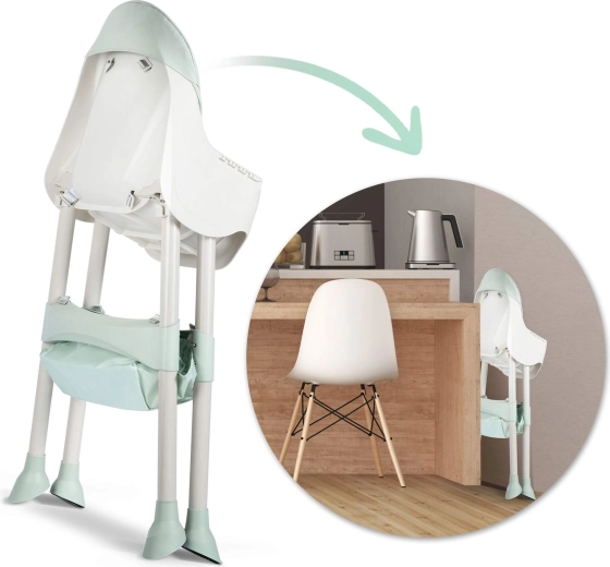 Scaun înalt pentru hrănire, scăunel jos sau booster – schimbi configurația printr-un singur click, în funcție de vârstă și nevoile copilului.