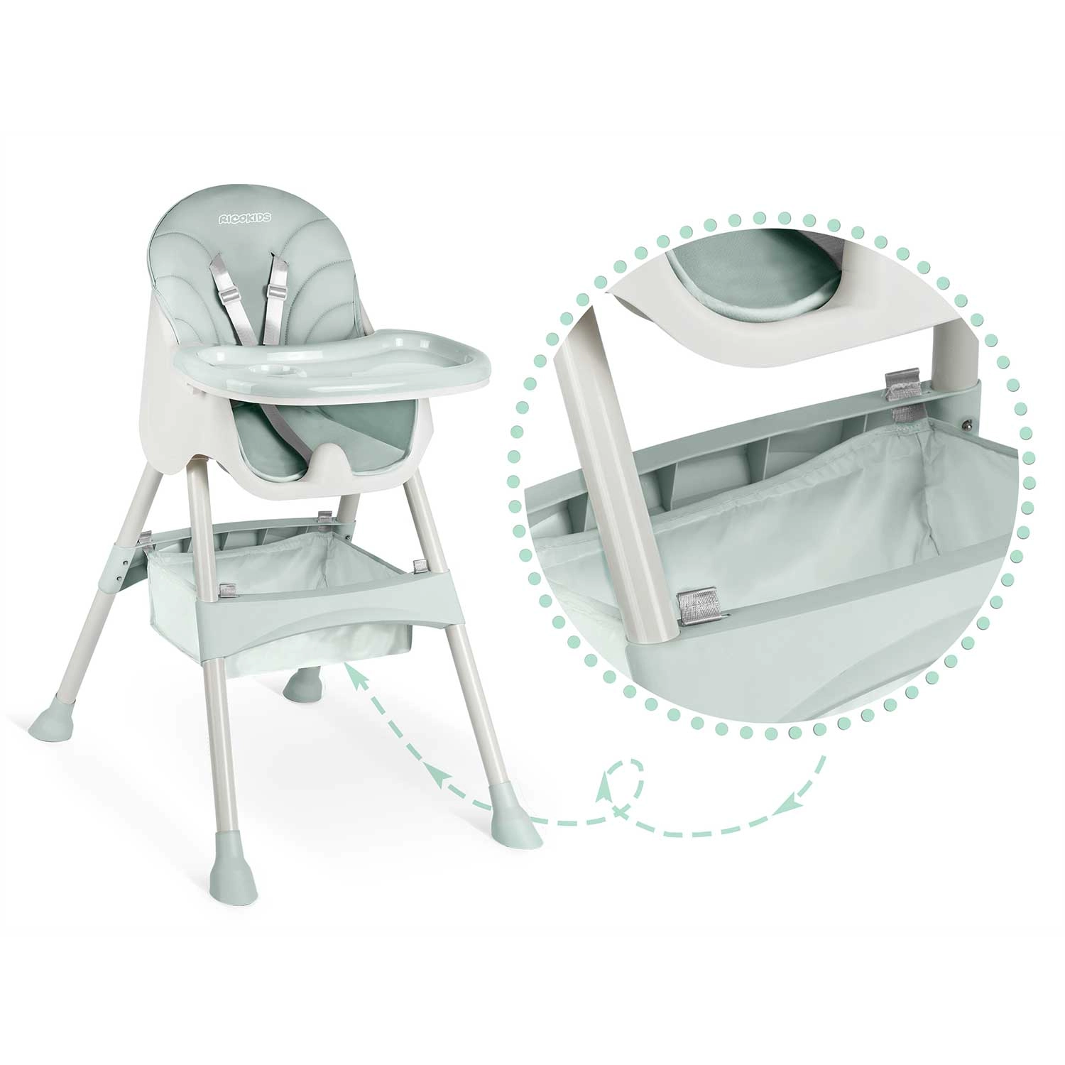 - 3‑în‑1 – crește odată cu copilul: scaun înalt, scăunel jos, booster.