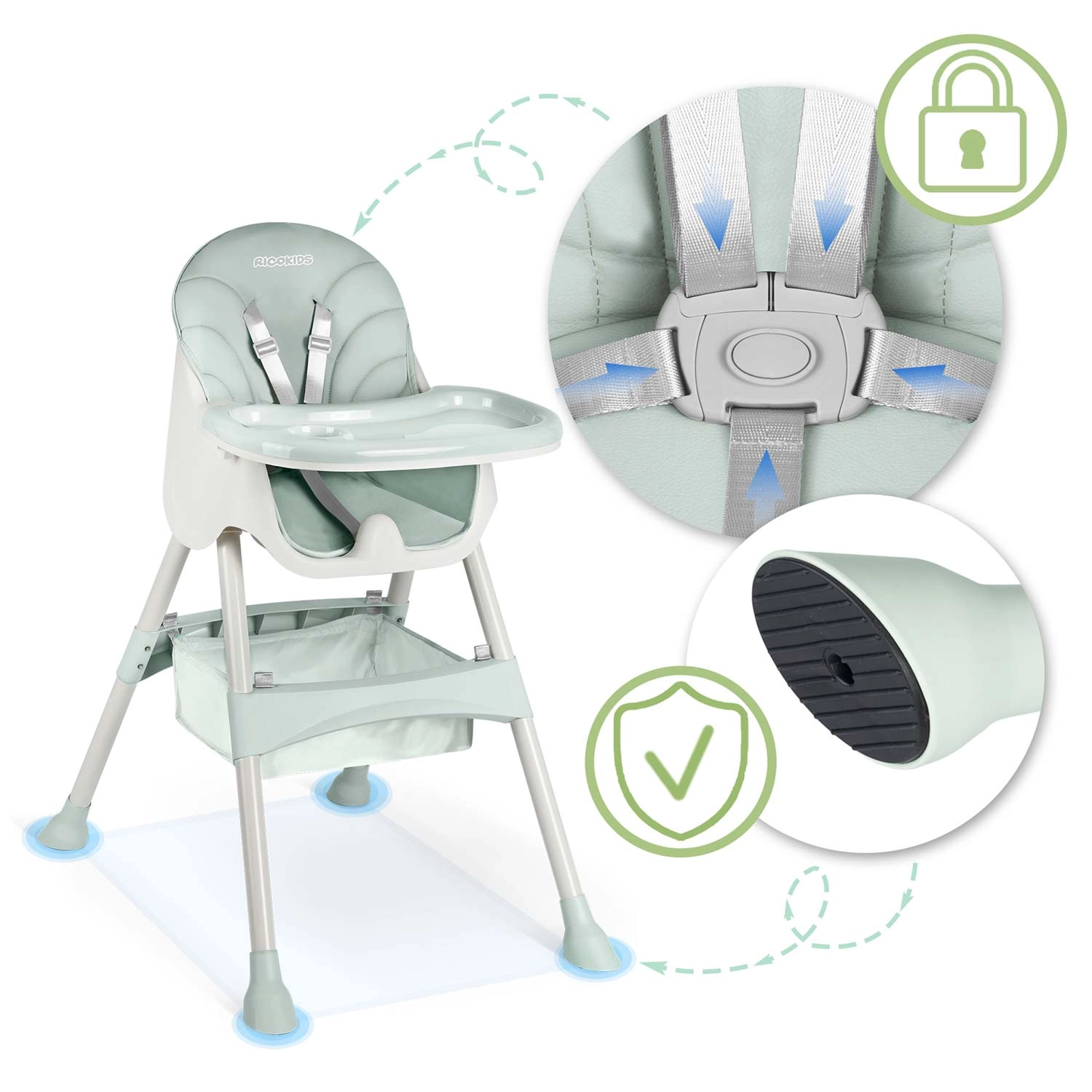 - Stabilitate și siguranță: centuri în 5 puncte, capete antiderapante la picioare.