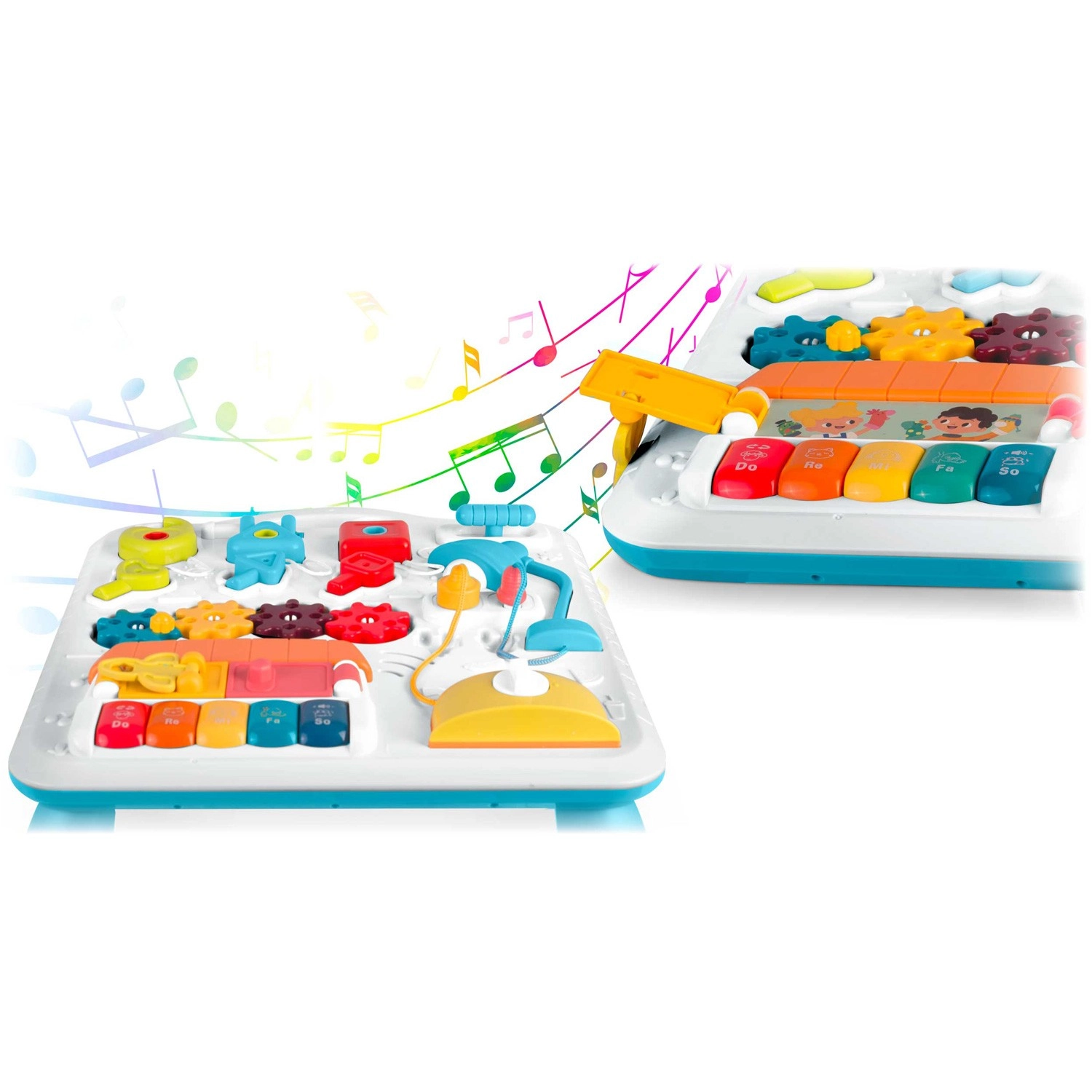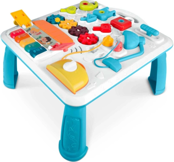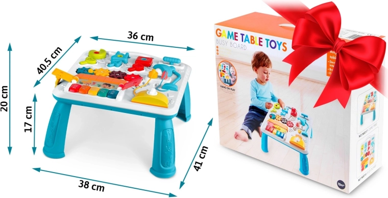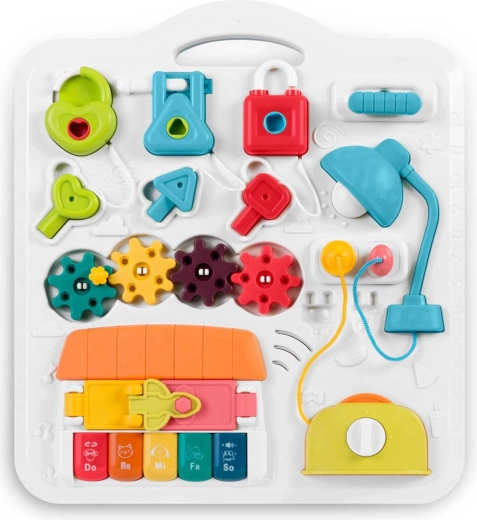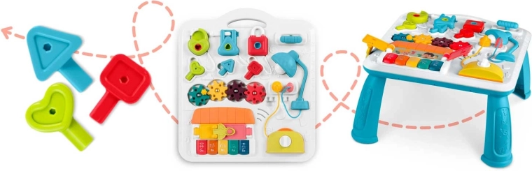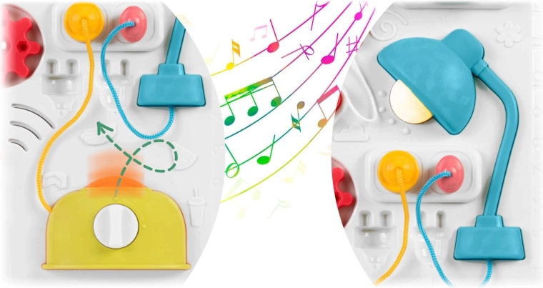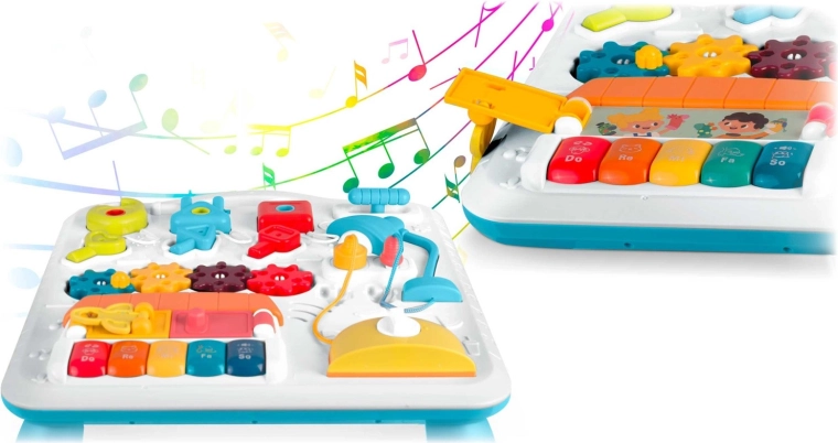 Măsuța și panoul pentru copii, multifuncționale într-un singur produs, susțin dezvoltarea senzomotorie și învățarea prin joc. Datorită panoului detașabil, copilul îl poate folosi atât pentru joaca în picioare, cât și ca panou senzorial portabil pe podea sau în călătorii. Paleta bogată de elemente – pian cu tonuri și sunete de animale, lampă care se aprinde, rotițe, glisoare, „prăjitor” extensibil, căsuță cu ușiță și trei lacăte cu cheițe – sprijină coordonarea mână–ochi, logica și recunoașterea formelor.