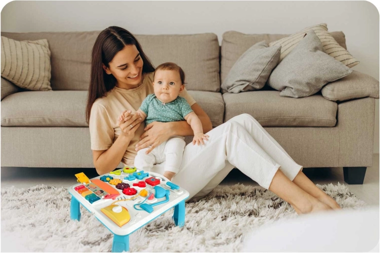 Transformați rapid panoul educativ portabil într-o măsuță de joacă pe picioare. Jocul așezat sau în picioare susține diferite etape de dezvoltare și independența copilului.