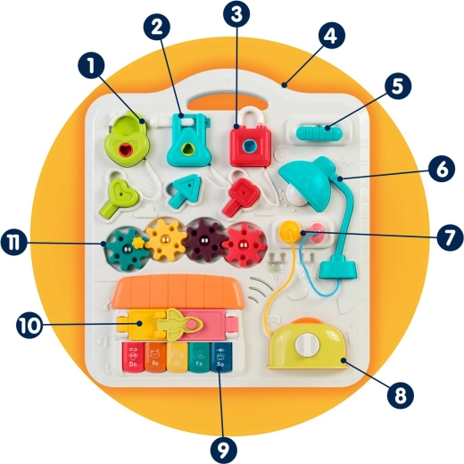 Roticele, glisoarele, „prăjitorul” extensibil și trei lacăte cu cheițe (inimă, triunghi, dreptunghi) dezvoltă prinderea, coordonarea și gândirea logică.