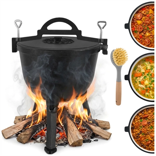 Ideal pentru mâncăruri la un singur vas precum gulaș, lecso, fasole la ceaun, borș sau supe. Conducerea uniformă a căldurii minimizează riscul de lipire, iar capacul ajută la păstrarea suculenței și a aromei. Picioarele deșurubabile asigură stabilitate în vatră și dimensiuni compacte la depozitare, iar clema superioară cu mânere permite agățarea pe cârlig sau traversă.