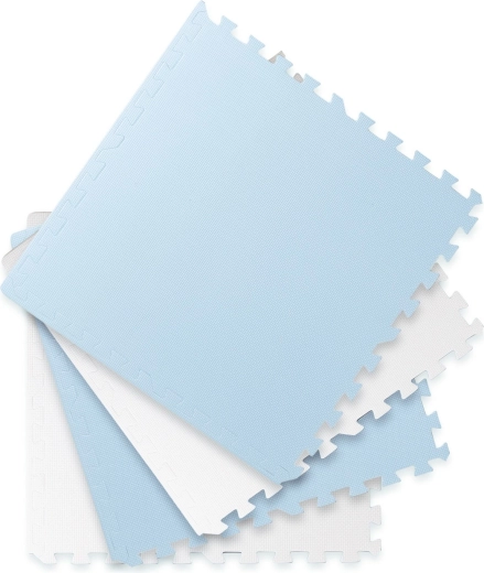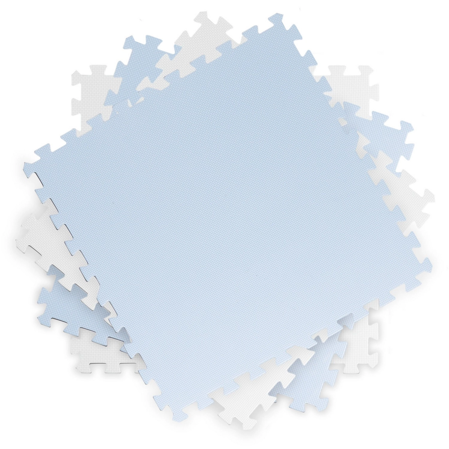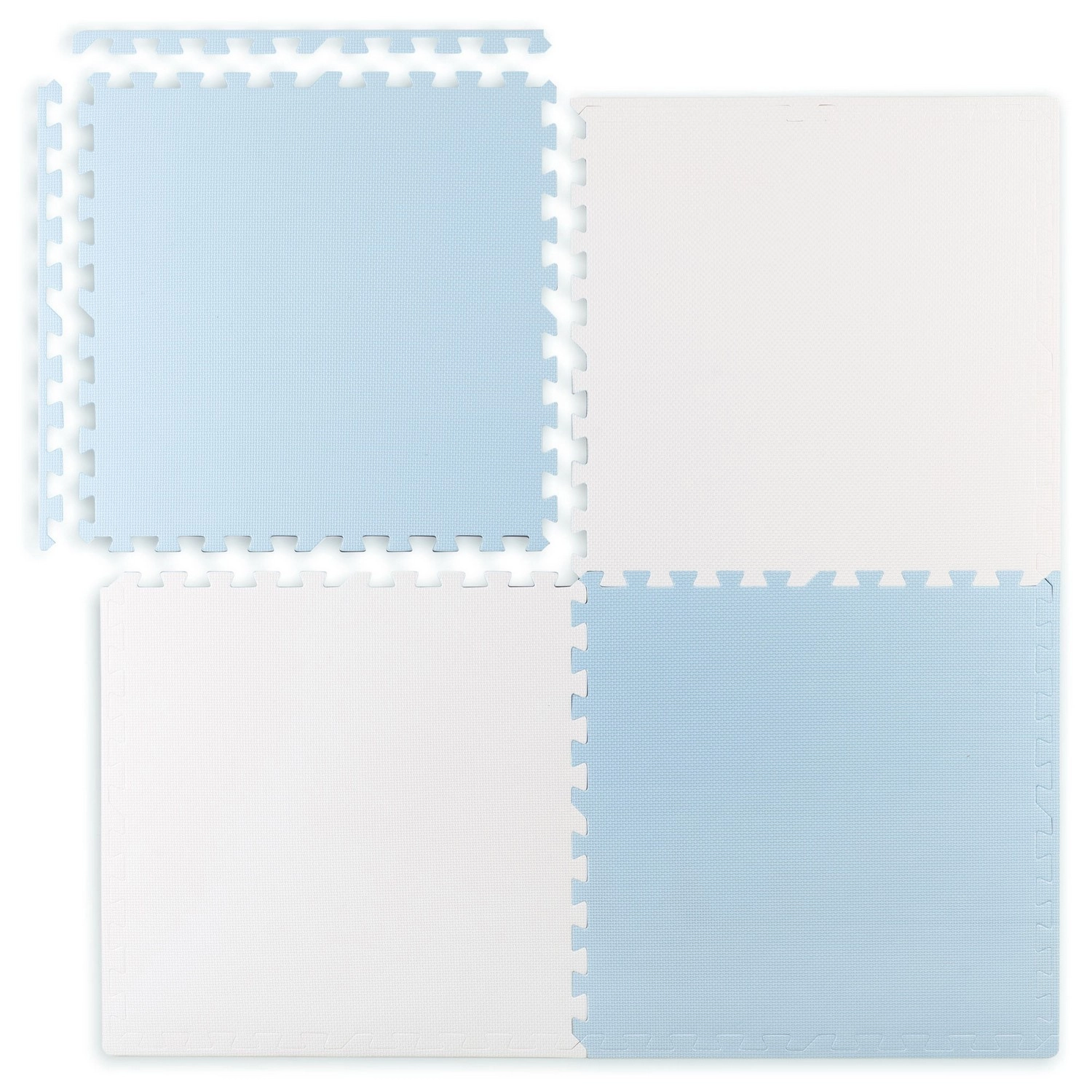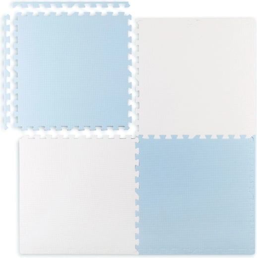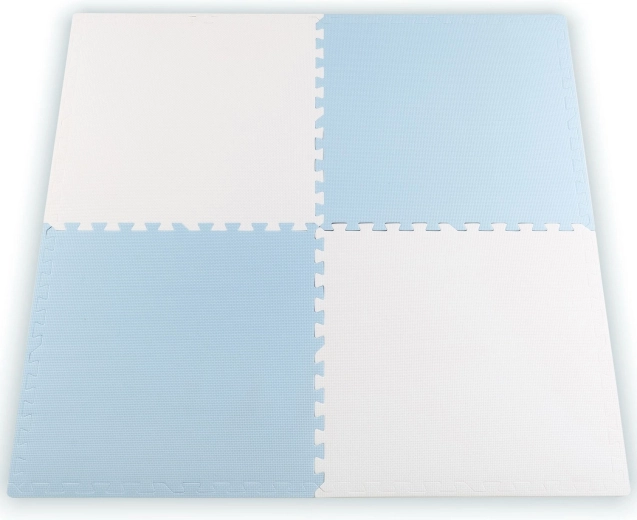 Cele patru piese mari (60 × 60 × 1 cm), cu benzi de margine, se îmbină perfect și creează o suprafață de 120 × 120 cm. Datorită combinației bicolore, albastru-alb, pe ambele fețe, puteți aranja cu ușurință un model tip șah, câmpuri monocrome sau alte modele. Piesele pot fi conectate într-o suprafață plană sau folosite pentru a crea forme 3D simple, de exemplu o căsuță pentru joacă.
