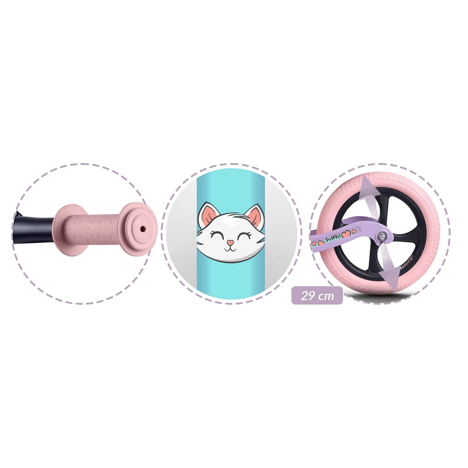 Șaua moale din spumă, ergonomică, cu reglare lină a înălțimii (aprox. 35–42 cm), crește odată cu copilul și asigură confort la fiecare plimbare. Mânerele din cauciuc cu opritoare oferă siguranță și control la direcție, în timp ce ghidonul lat și ampatamentul stabil susțin învățarea naturală a echilibrului.