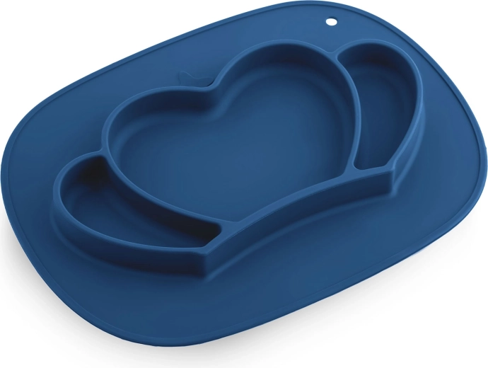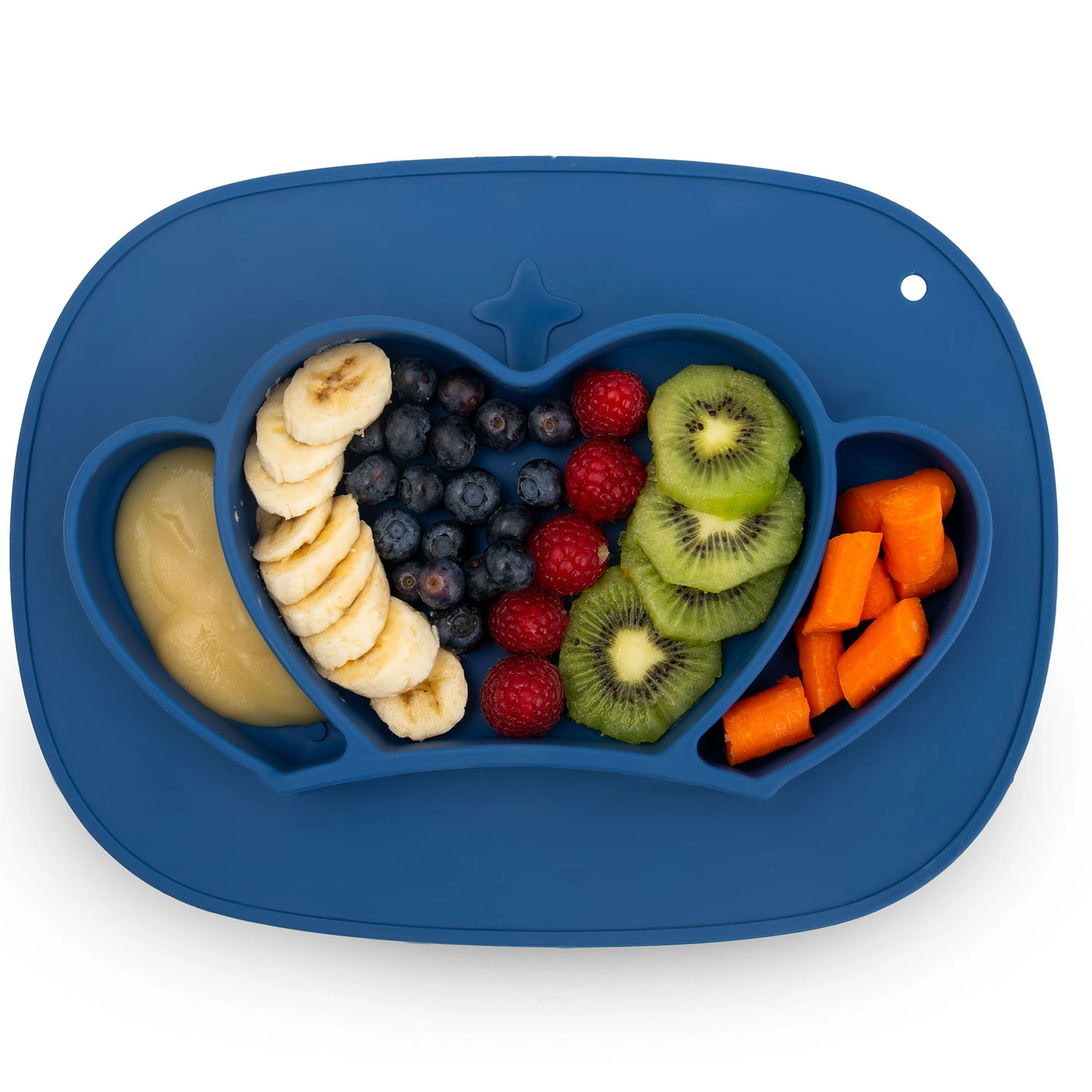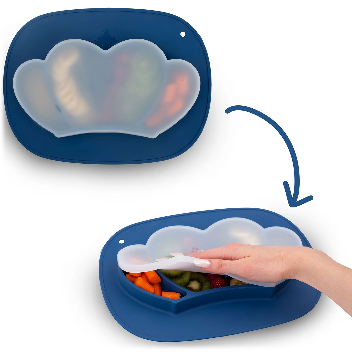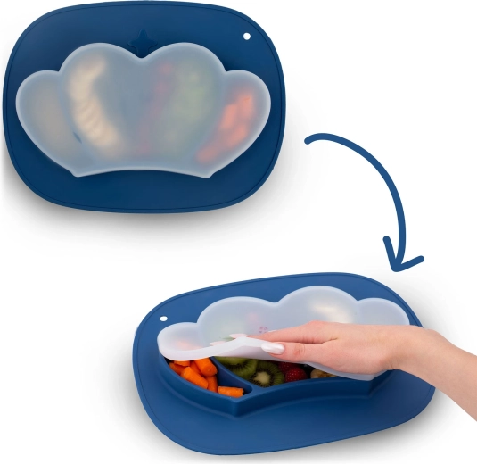 Farfuria compartimentată din silicon cu ventuză ajută la separarea gusturilor și a porțiilor, încurajează hrănirea independentă și limitează vărsările. Siliconul alimentar de calitate este fără BPA, ftalați și PVC, durabil și plăcut moale la atingere. Capacul integrat menține mâncarea proaspătă mai mult timp și este excelent pentru călătorii.