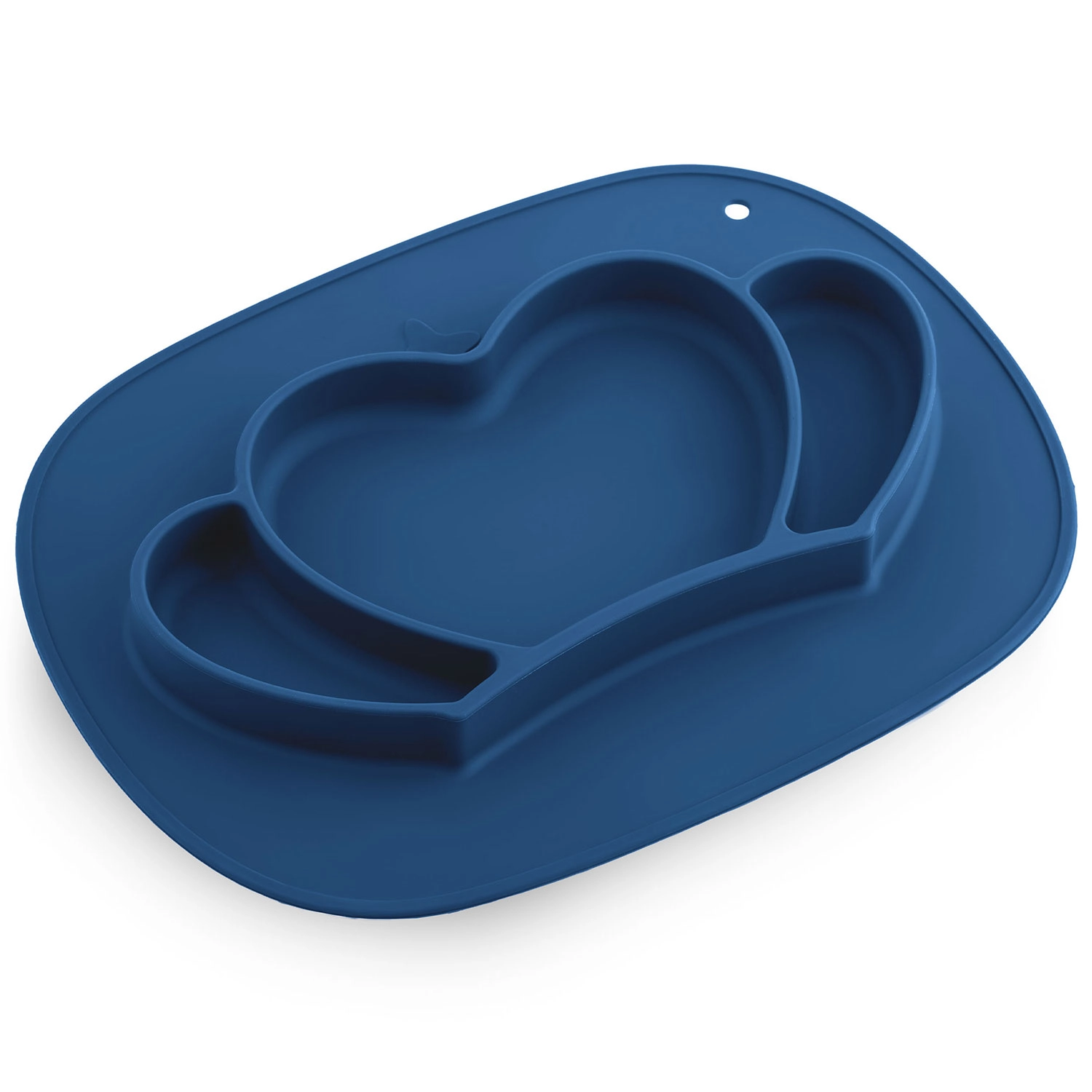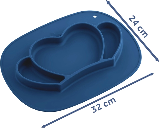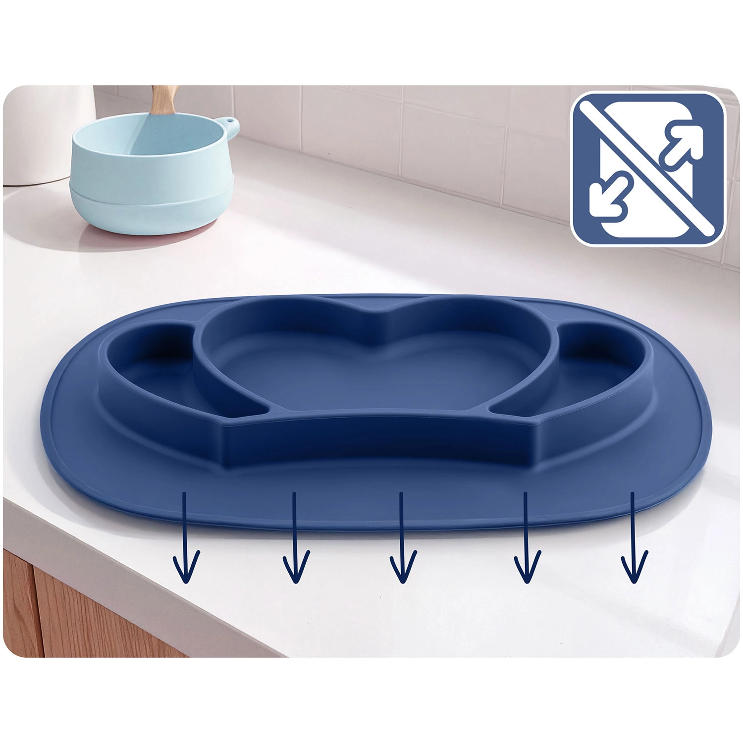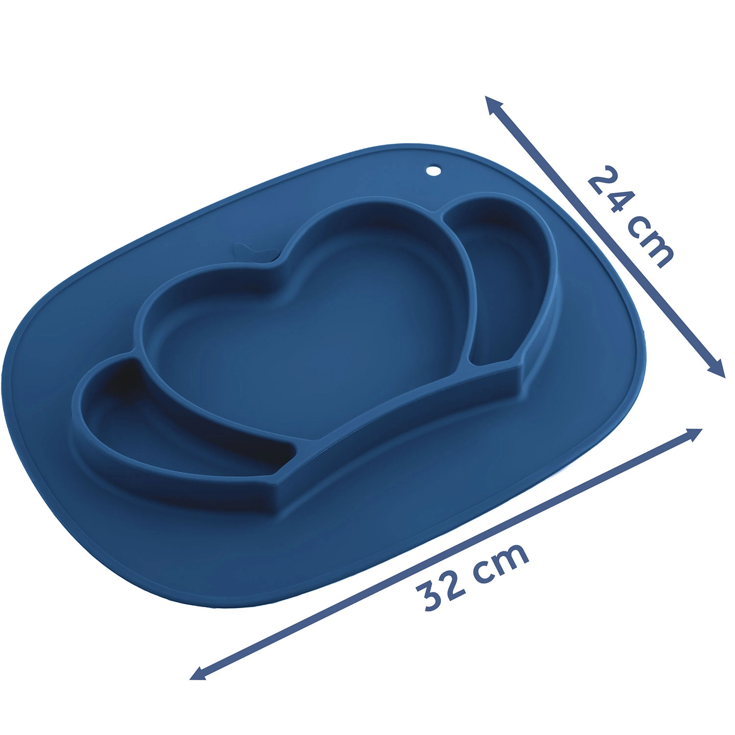 Farfuria compartimentată din silicon cu ventuză ajută la separarea gusturilor și a porțiilor, încurajează hrănirea independentă și limitează vărsările. Siliconul alimentar de calitate este fără BPA, ftalați și PVC, durabil și plăcut moale la atingere. Capacul integrat menține mâncarea proaspătă mai mult timp și este excelent pentru călătorii.