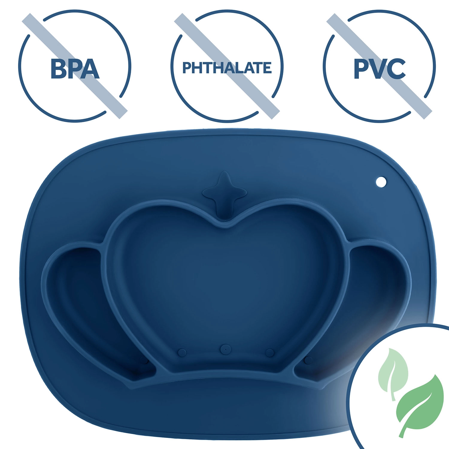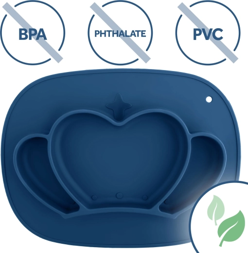 Farfurie practică din silicon pentru copii, în formă de coroană, cu trei compartimente, asigură mai puțină murdărie și mai multă bucurie la masă. Datorită bazei aderente, rămâne fixată pe masă, are execuție sigură 100% fără BPA, este potrivită pentru mașina de spălat vase, cuptorul cu microunde și cuptor și este livrată cu capac flexibil pentru păstrarea prospețimii și călătorii ușoare.
