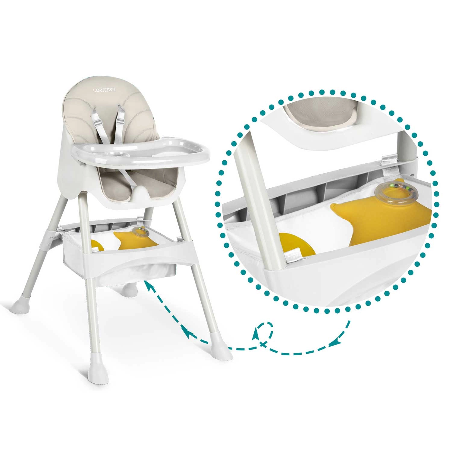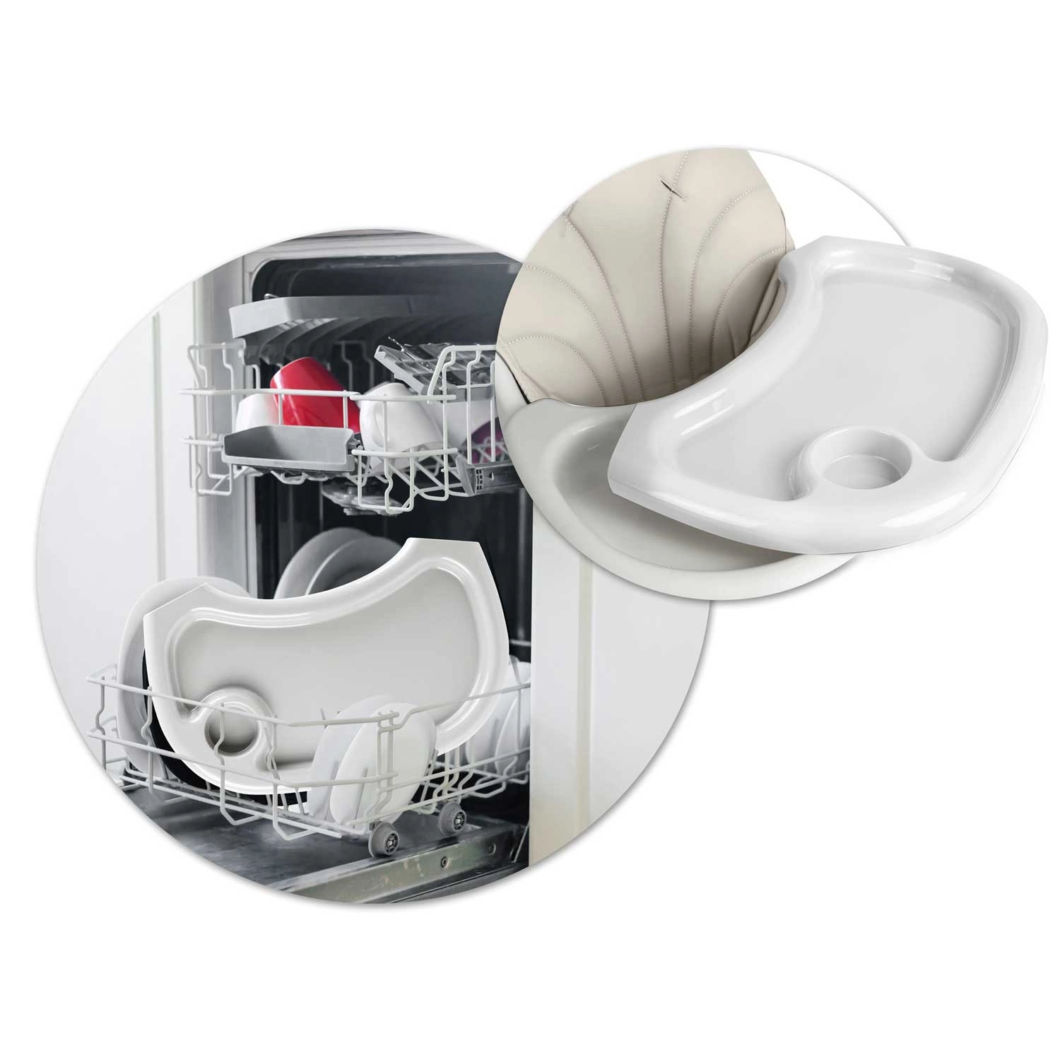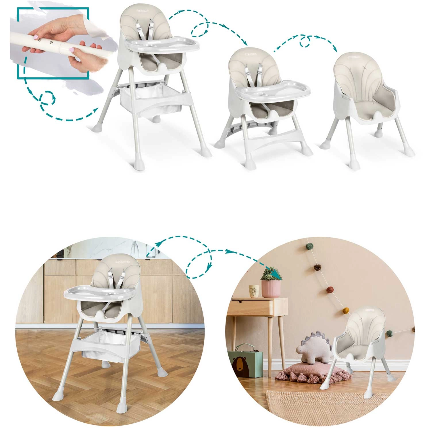 Siguranța este pe primul loc: centuri în 5 puncte, capete antiderapante la picioare și o construcție conformă standardului european EN 14988 oferă siguranță la masă și la joacă. Tapițeria moale este din material care nu absoarbe murdăria – este suficient să o ștergi cu o lavetă umedă. În plus, include coș de depozitare pentru jucării și accesorii și bavetă din silicon gratuit.