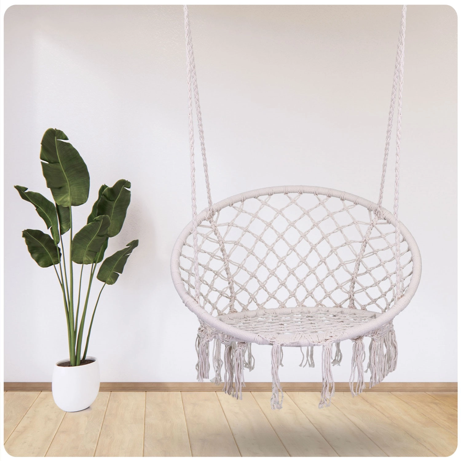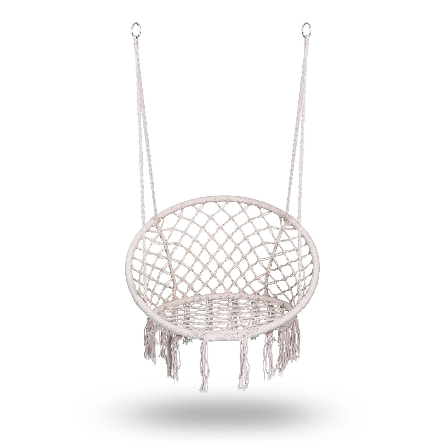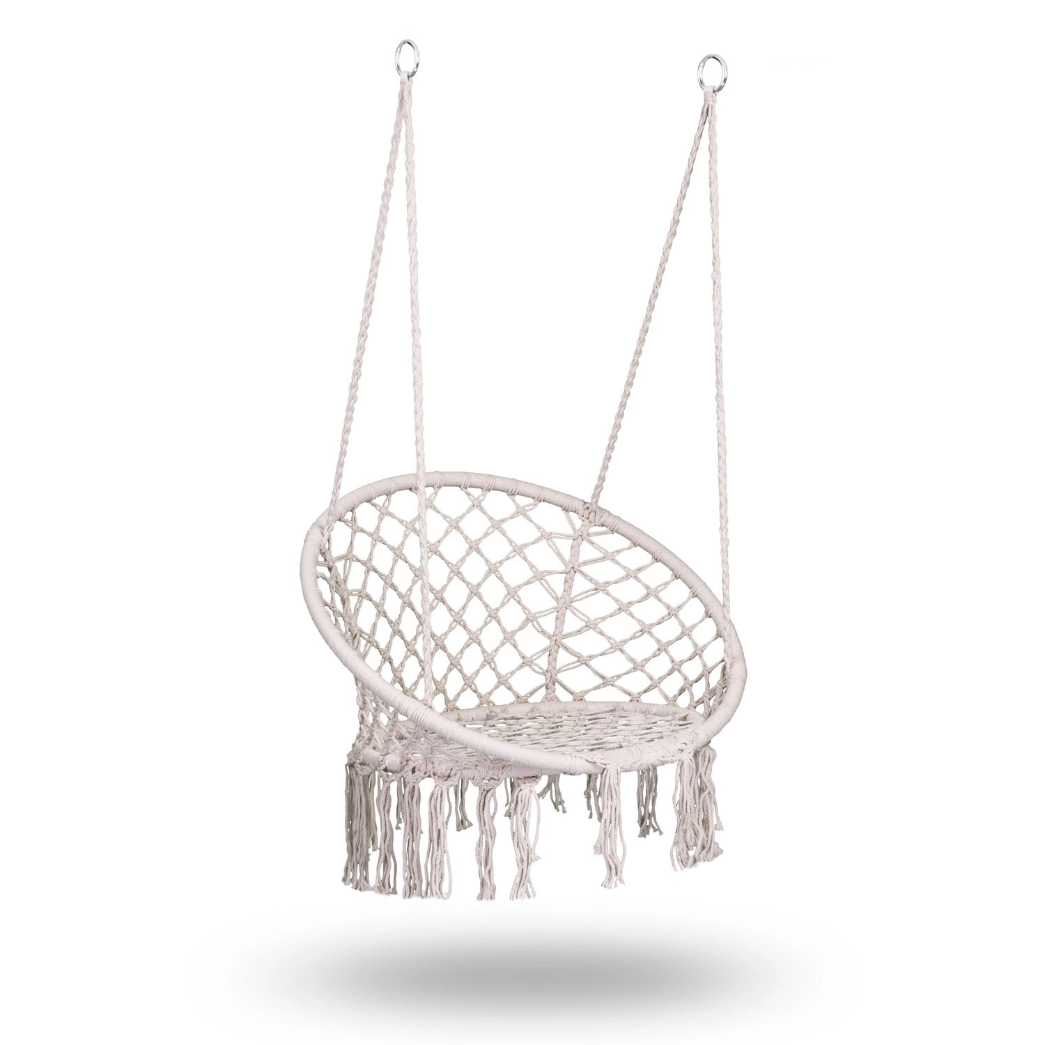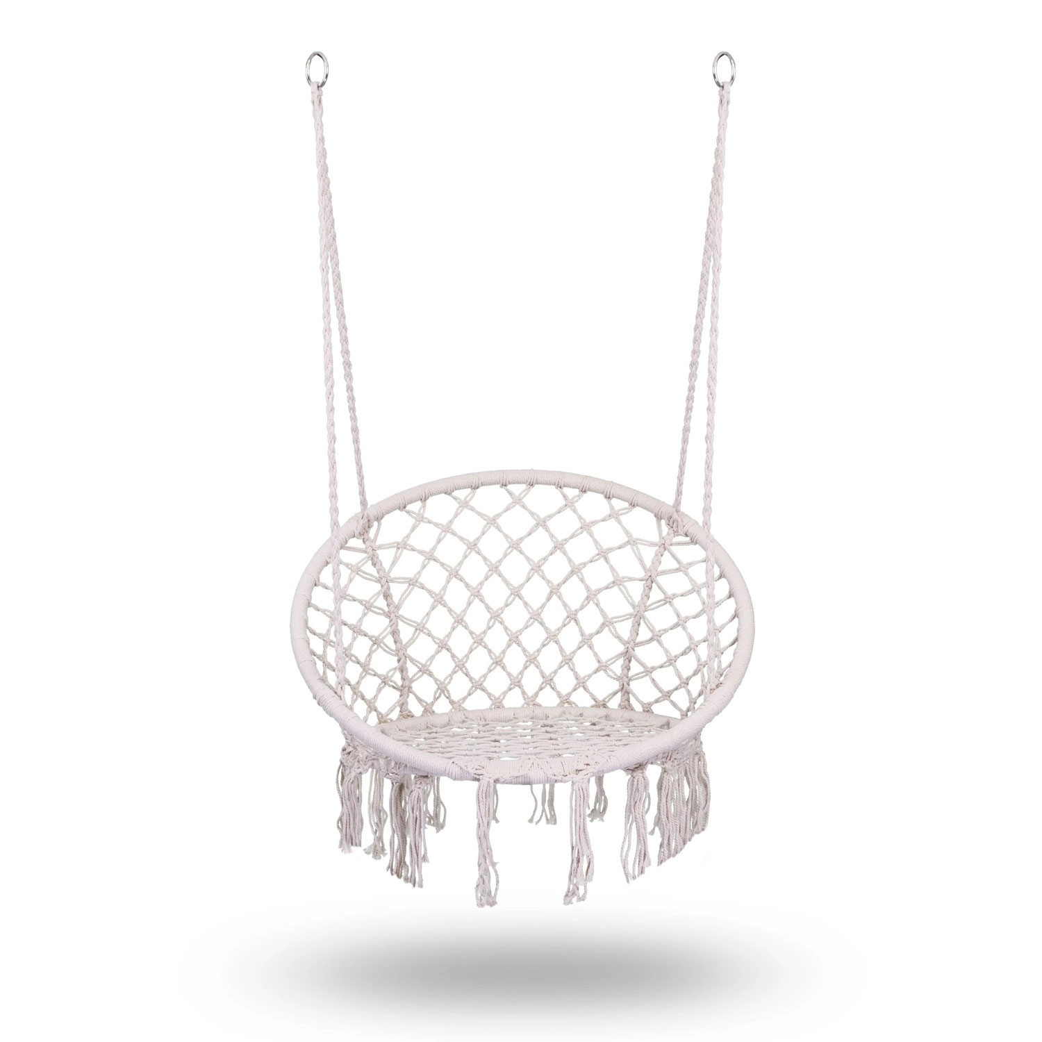 Bucură-te de relaxare și confort într-un elegant scaun suspendat boho în culoare bej. Structura metalică solidă, funii suspendate împletite dublu și capacitate de încărcare până la 150 kg asigură legănare în siguranță, atât în interior, cât și în exterior. Șezutul lat, spătarul înalt și ciucurii macramé stilizați oferă o atmosferă deosebită interiorului și terasei tale.
