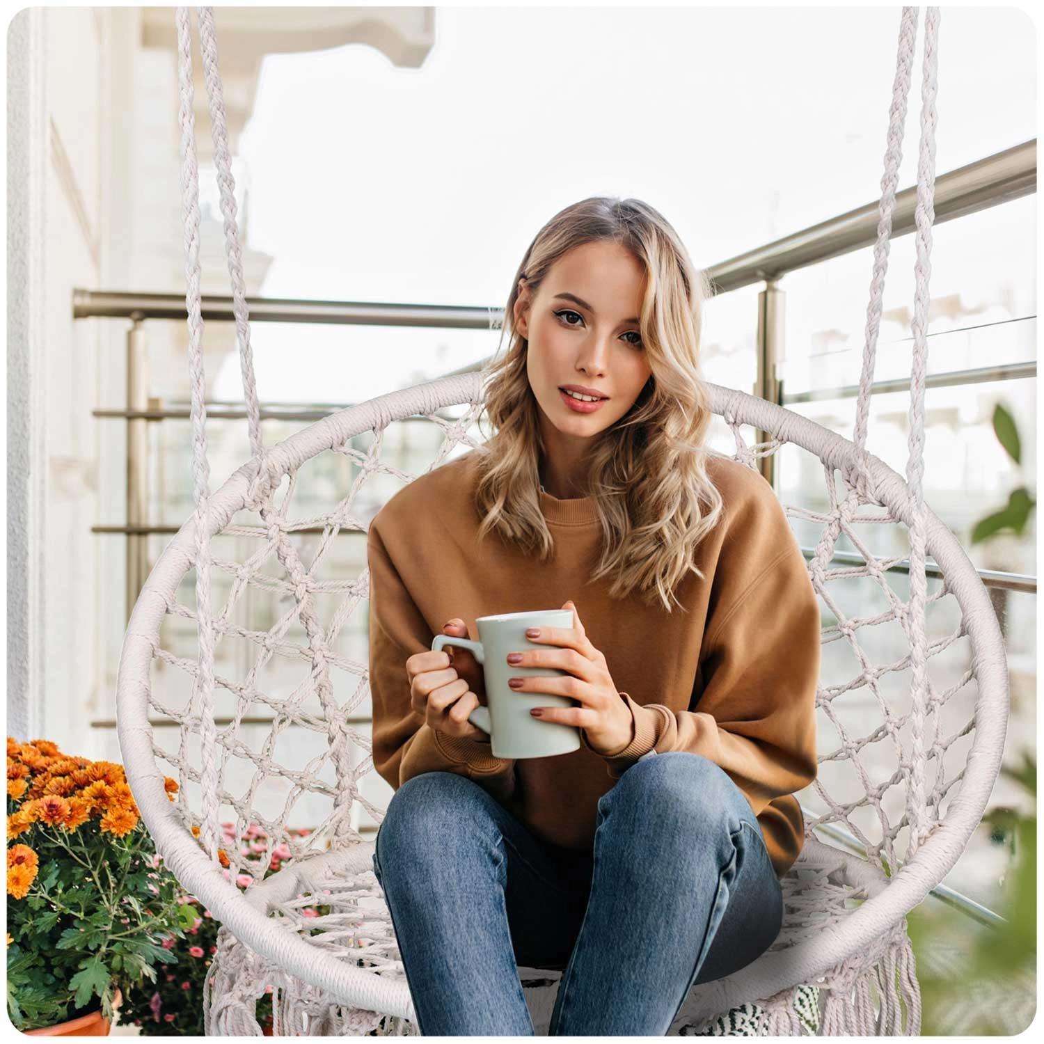 Designul bej elegant, cu ciucuri, înveselește livingul, dormitorul, balconul și grădina. Scaunul se leagănă ușor și creează o atmosferă primitoare.