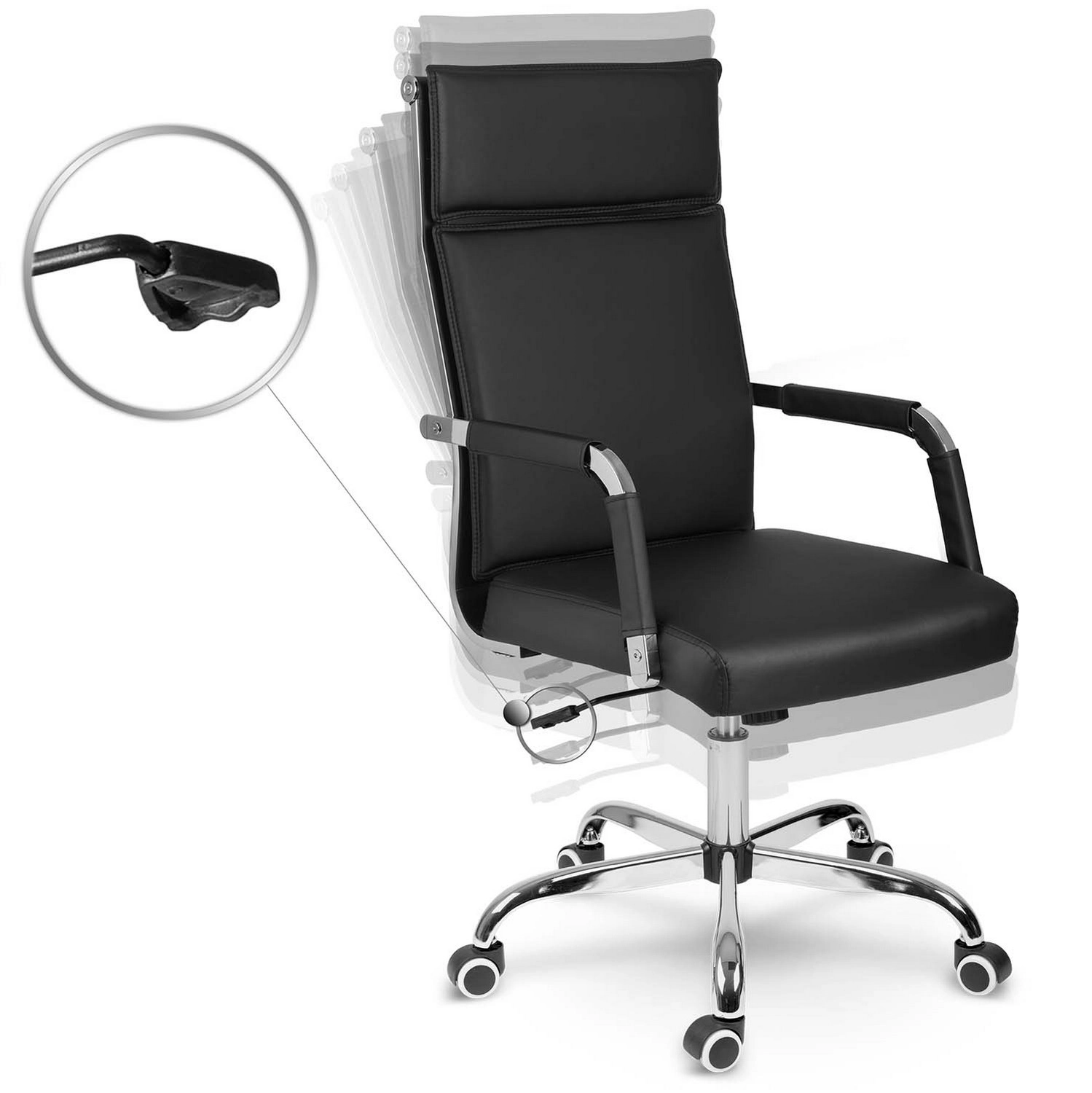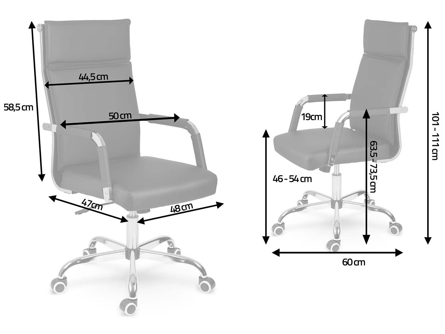 Șezutul cu piston pe gaz permite reglarea înălțimii în funcție de biroul tău, în timp ce mecanismul de balansare cu posibilitate de blocare aduce relaxare în zilele solicitante. Baza cromată cu cinci brațe, cu o construcție stabilă, și roțile duble cauciucate protejează podeaua de zgârieturi și asigură o mișcare lină.