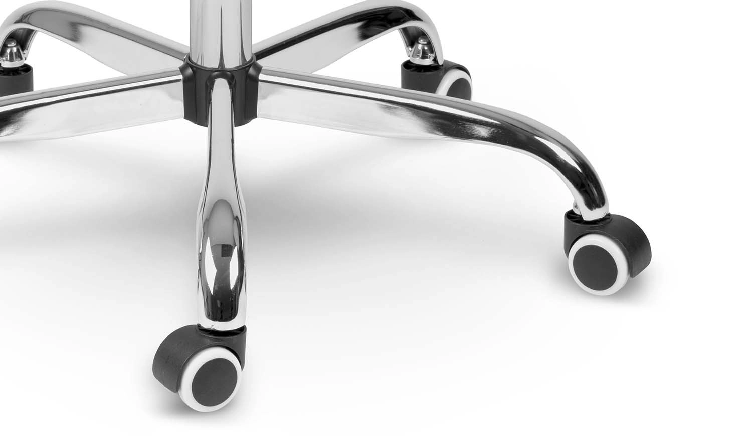 Baza stabilă cu cinci brațe, cromată, și roțile duble silențioase protejează podeaua împotriva zgârieturilor și asigură o rulare lină.
