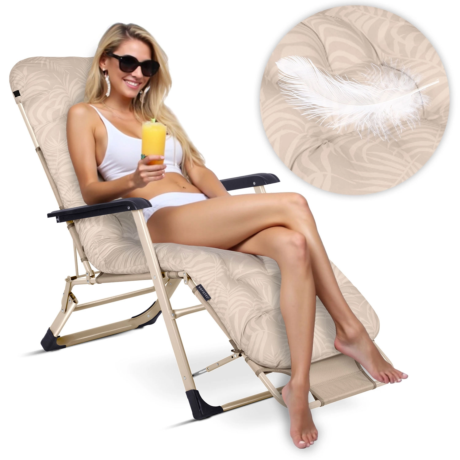 Bucurați-vă de relaxare în aer liber fără compromisuri cu șezlongul stilat Sofotel ChillWell. Datorită pernei moi, gros generos capitonate, unghiului reglabil până la poziție întins și construcției durabile, este ideal pentru grădină, terasă și plajă. Țesătura cu uscare rapidă, rezistența la UV și designul pliabil asigură confort, întreținere ușoară și transport facil.