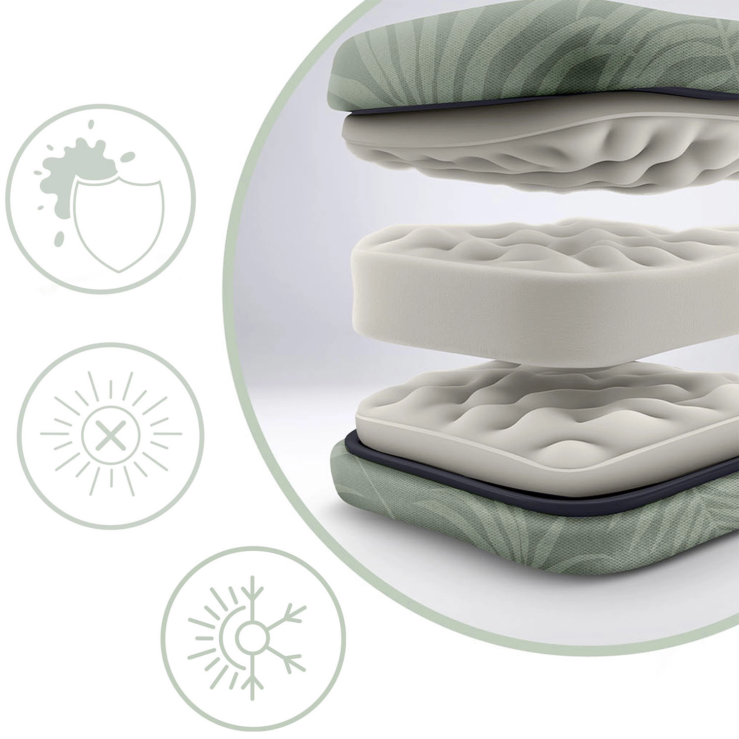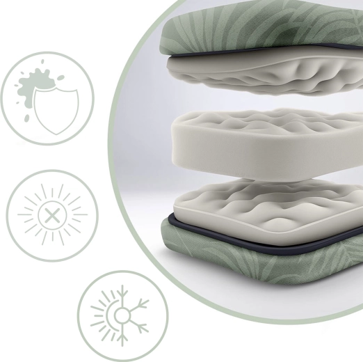 Perna moale, elastică și matlasată, cu husă plăcută din Texline, oferă confort pe tot parcursul zilei și este rezistentă la tasare și la radiațiile UV.
