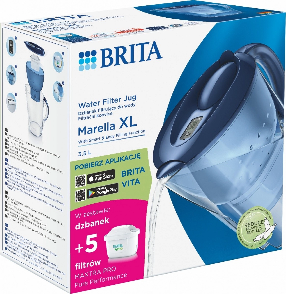 BRITA Marella XL asigură acces constant la apă potabilă filtrată fără a fi nevoie să cumperi băuturi îmbuteliate. Îmbunătățește gustul băuturilor reci și calde, reduce formarea calcarului în fierbător și espressor și ajută pe termen lung la economisirea banilor și protejarea mediului.