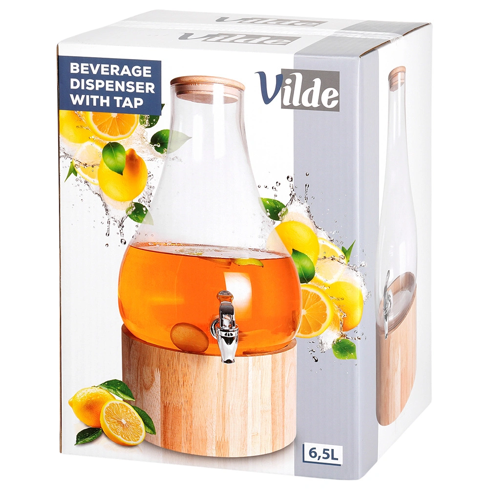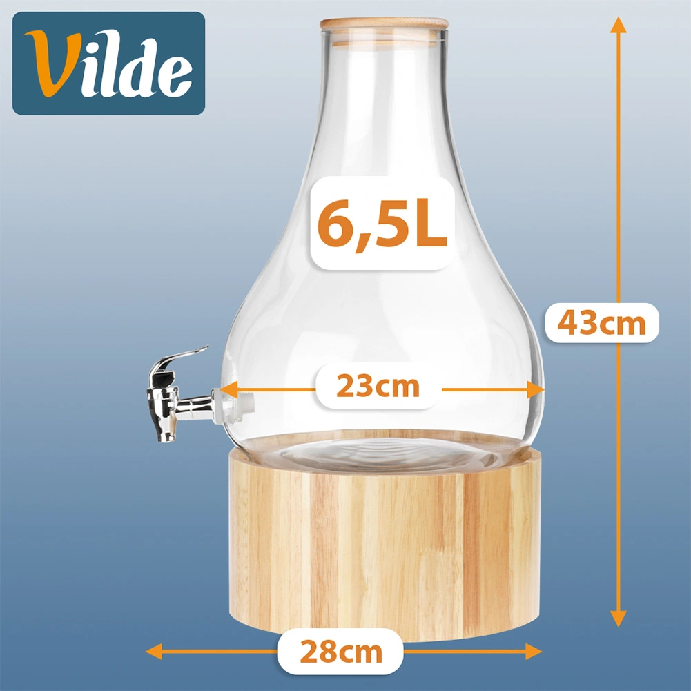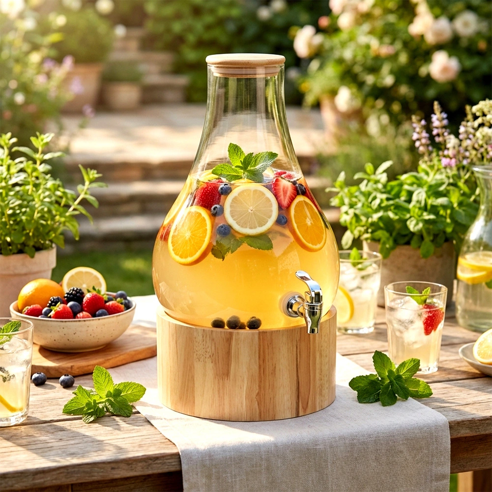 Dozator elegant din sticlă cu volum de 6,5 l, cu suport din lemn și capac din bambus, ideal pentru servirea limonadelor, apei sau punciului. Datorită robinetului practic și suportului înălțat, turnarea este extrem de comodă, în timp ce capacul etanș din bambus protejează băuturile de impurități și insecte. Sticlă groasă și rezistentă, utilizare ușoară și versatilitate pentru petreceri în grădină, acasă și în gastronomie.