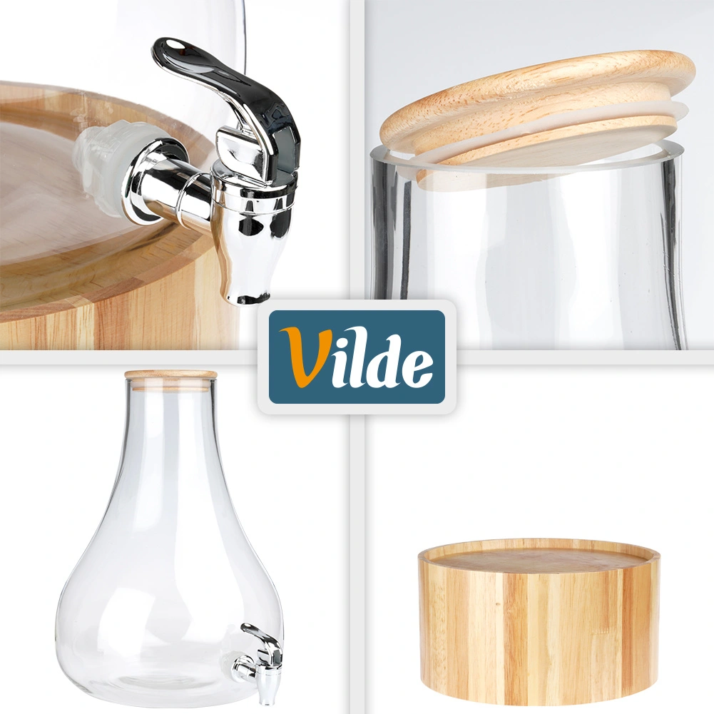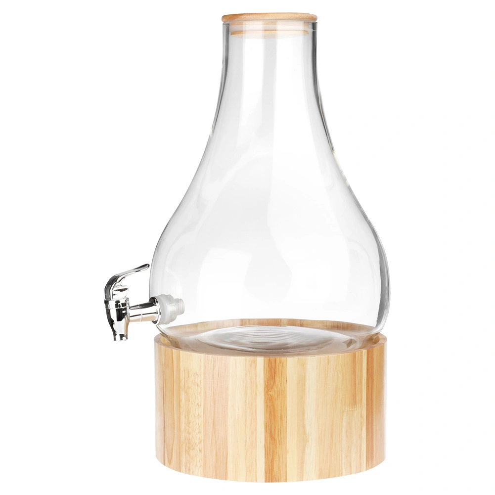 Dozatorul elegant de băuturi din sticlă groasă de calitate îmbină designul natural cu funcționalitatea. Capacul din bambus cu garnitură menține conținutul proaspăt și protejat, iar aspectul metalic al robinetului permite turnare lină și curată. Datorită suportului stabil din lemn, gura de scurgere este la înălțimea ideală pentru pahare.