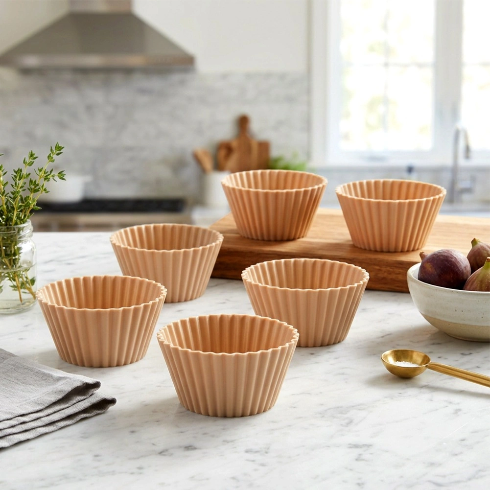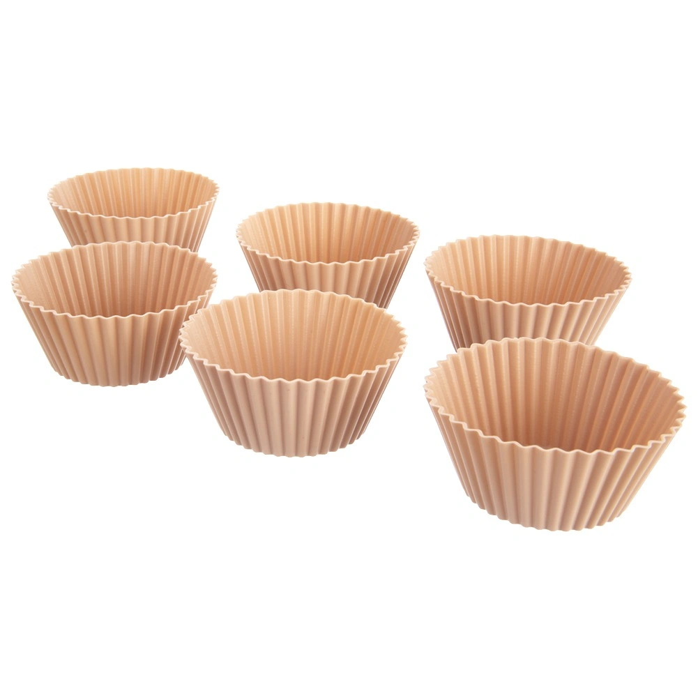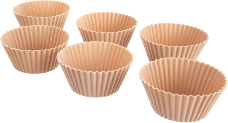 Set practic de șase forme din silicon pentru brioșe, în nuanță elegantă de bej, pentru coptul zilnic. Datorită materialului flexibil, aluatul nu se lipește, deserturile se scot ușor, iar formele sunt reutilizabile. Rezistă la temperaturi între -40 °C și +220 °C, astfel încât le poți folosi în cuptor, cuptorul cu microunde și congelator. Sunt compatibile cu mașina de spălat vase și reprezintă o alternativă ecologică la formele de hârtie.