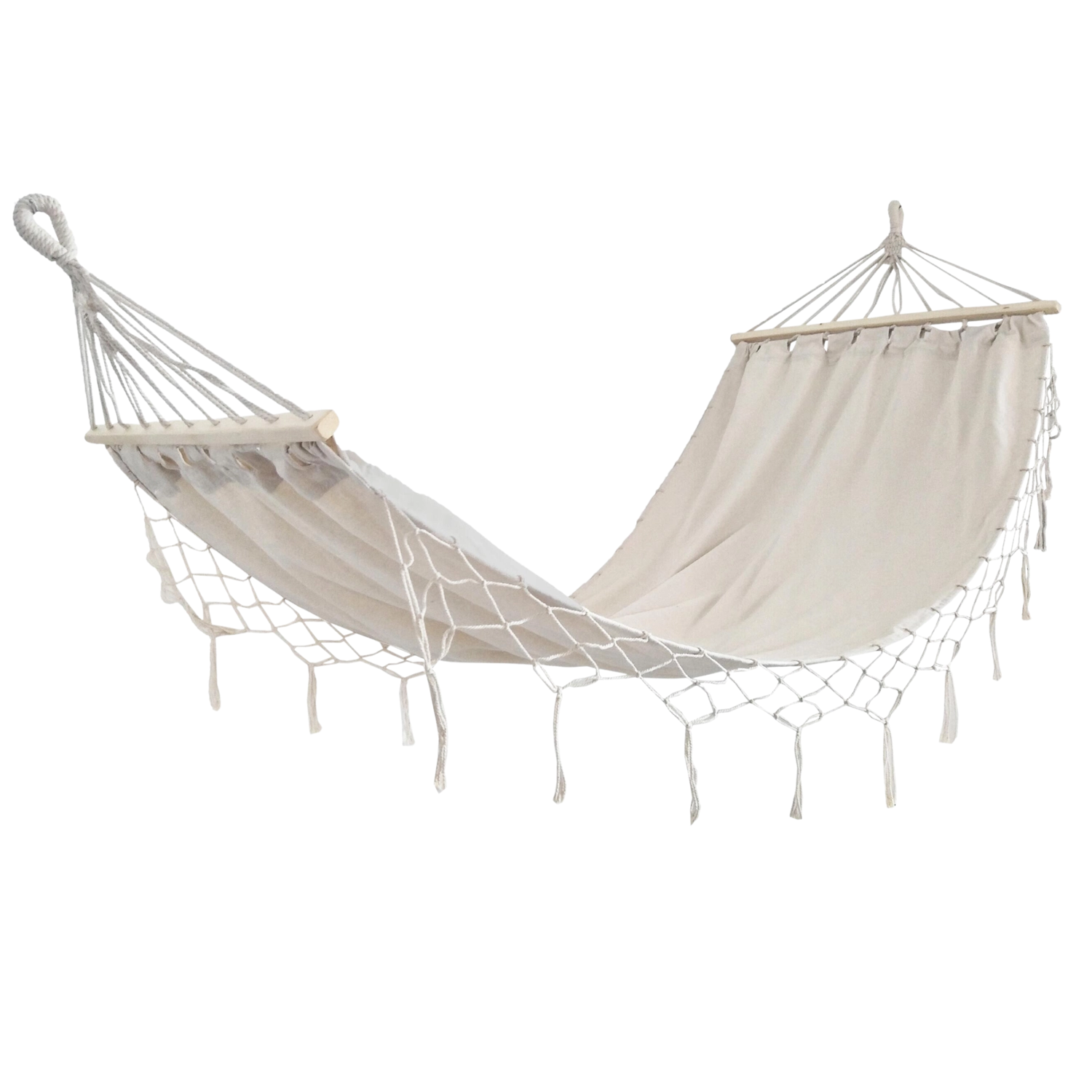 Acest hamac bej cu franjuri îmbină perfect designul și funcționalitatea. Nuanța naturală se potrivește ușor cu mobilierul de exterior și interior, în timp ce barele distanțiere din lemn mențin confortabil suprafața deschisă pentru citit, odihnă sau un pui de somn.