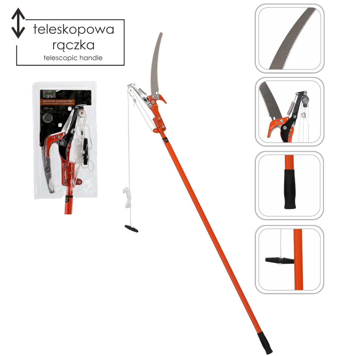 Ajungeți la crengile înalte fără scară. Foarfeca telescopică pentru crengi cu ferăstrău, cu o lungime de până la 250 cm, combină un tăiat puternic și un ferăstrău curbat pentru crengi mai groase. Datorită tijei telescopice, construcției robuste și mânerului confortabil, realizați tăieri sigure și precise atât în grădină, cât și în livadă.