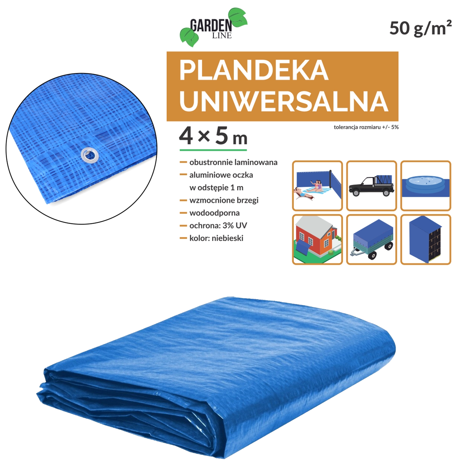 Prelată albastră ușoară și practică din PE rezistent, pentru utilizare versatilă. Oferă protecție impermeabilă și laminată pe ambele părți, cu margini întărite și ochiuri metalice pe contur. Ideală pentru acoperirea lemnului, mobilierului, materialelor de construcții sau ca strat de protecție pe sol. Gramaj 50 g/m², dimensiune 5 × 4 m (+/− 5%), cu stabilizare UV 3%.