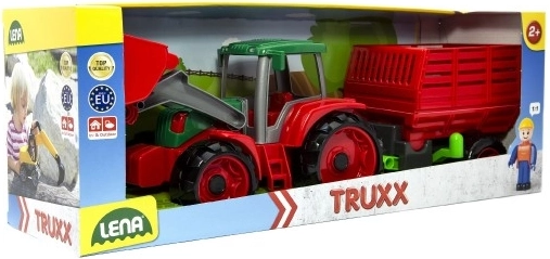 Vă prezentăm Lena Truxx tractor cu remorcă, jucărie ideală pentru micii fermieri. Acest tractor din plastic se remarcă prin designul său robust în culori roșu și verde, completat de o cupă funcțională și o remorcă detașabilă. În cabina tractorului este plasată o mică figurină șofer, care adaugă realism jocului.