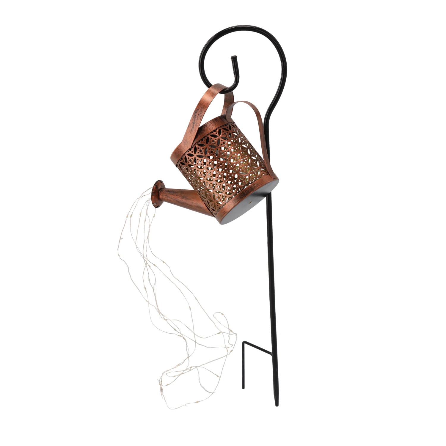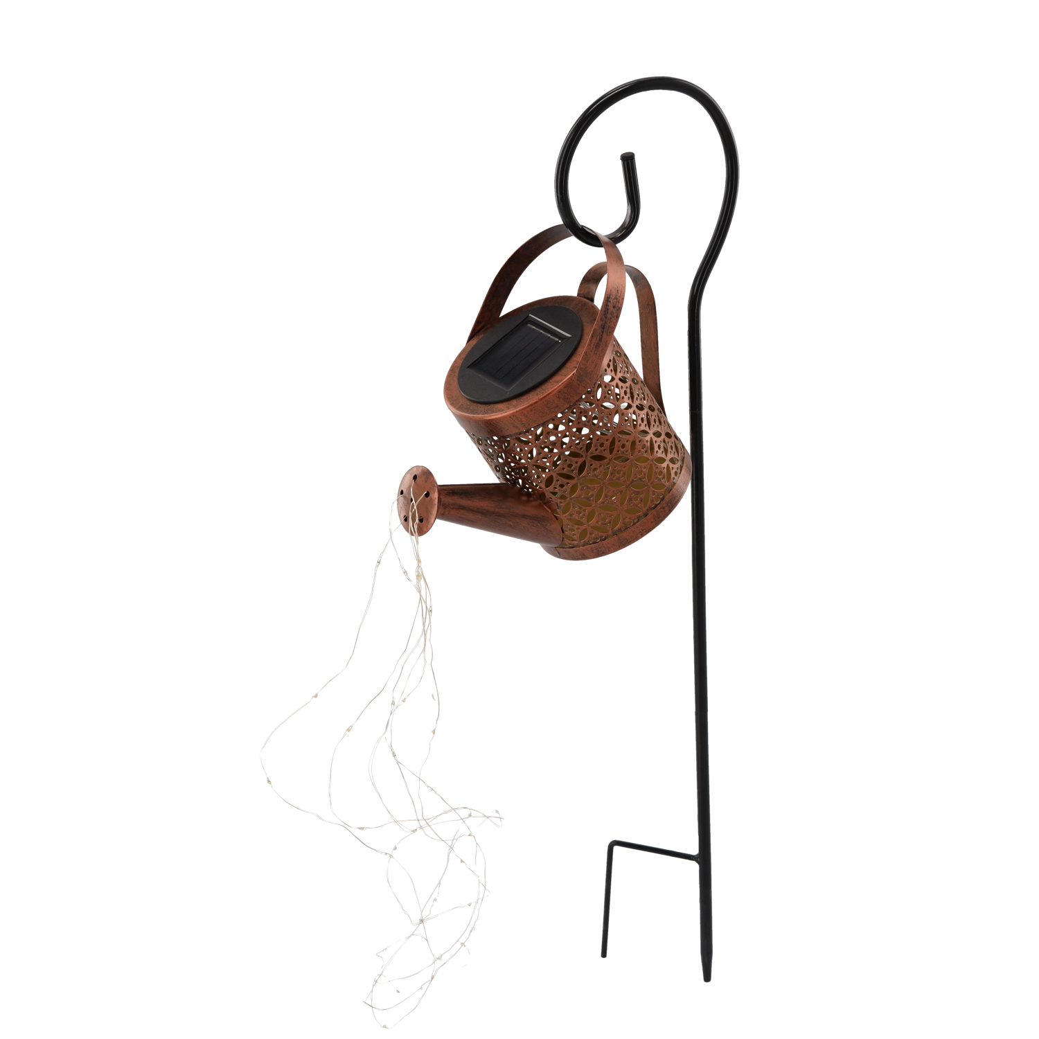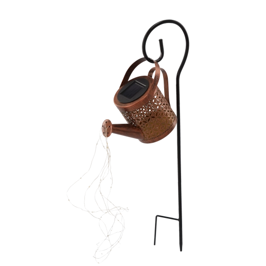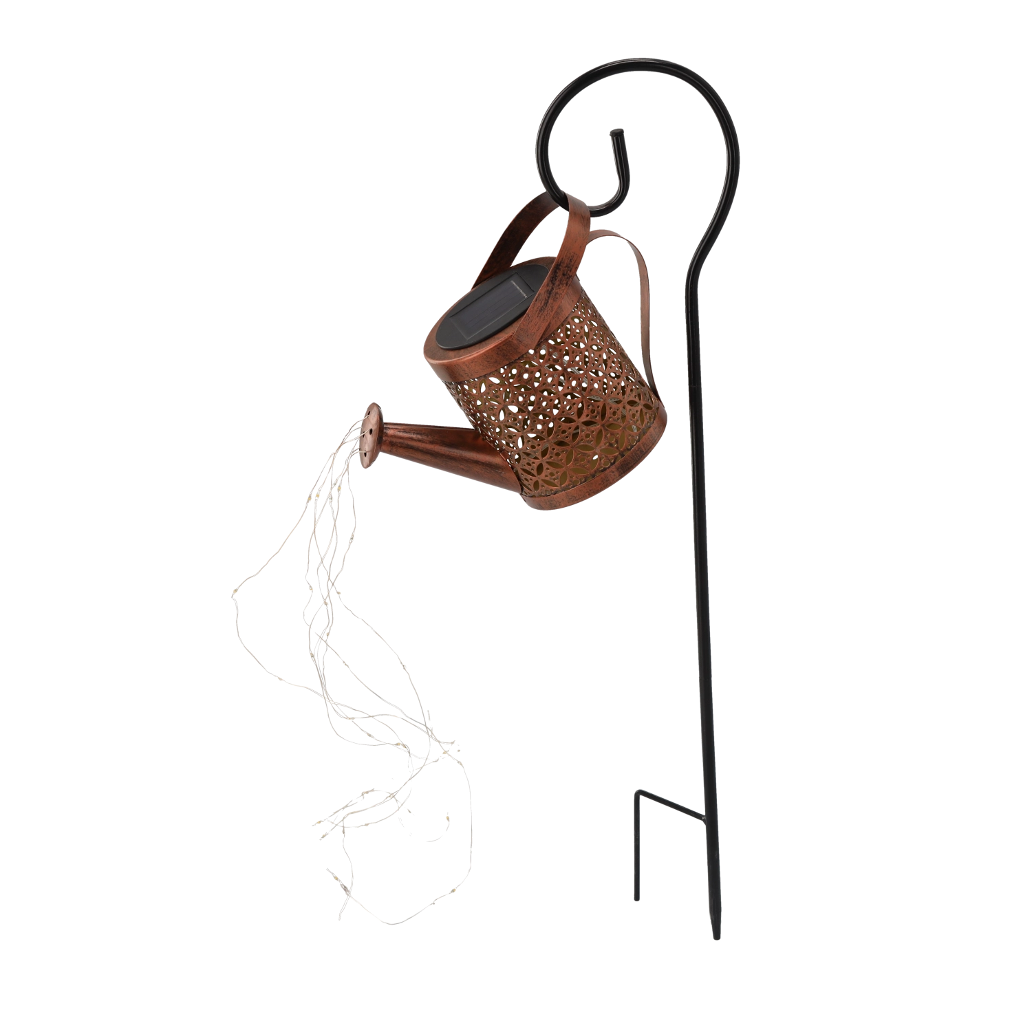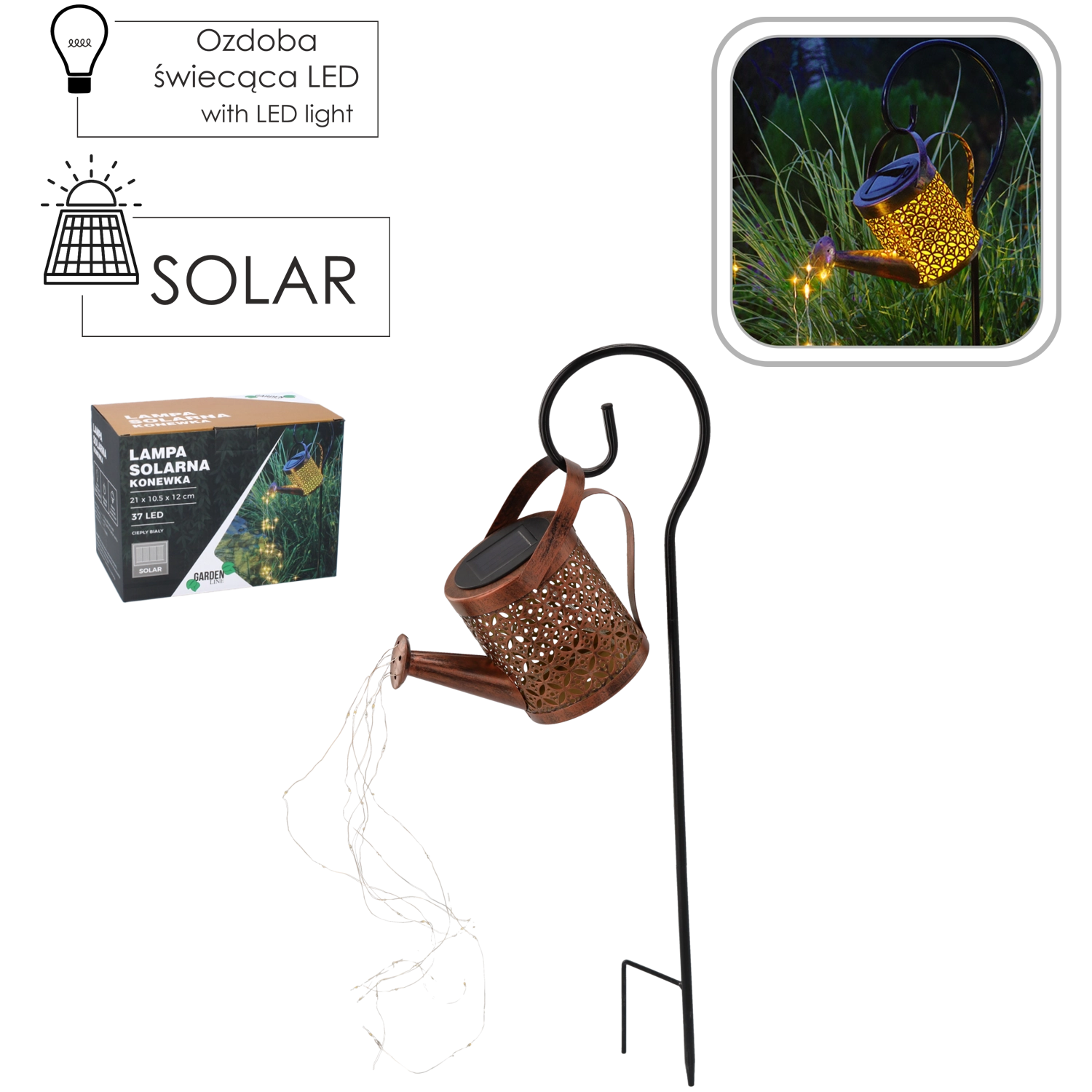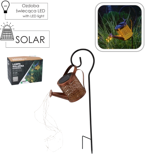 Lampa oferă 37 LED cu lumină alb cald, care, după încărcare completă, luminează aproximativ 6–7 ore. Include acumulator NI-MH reîncărcabil, protecție IP44 împotriva stropilor de apă și un cârlig practic pe suportul de agățare înfipt în sol, cu o înălțime totală de aproximativ 80 cm. Stropitoarea compactă (21 × 10,5 × 12 cm) se amplasează ușor în straturi, lângă iazuri sau pe terasă.