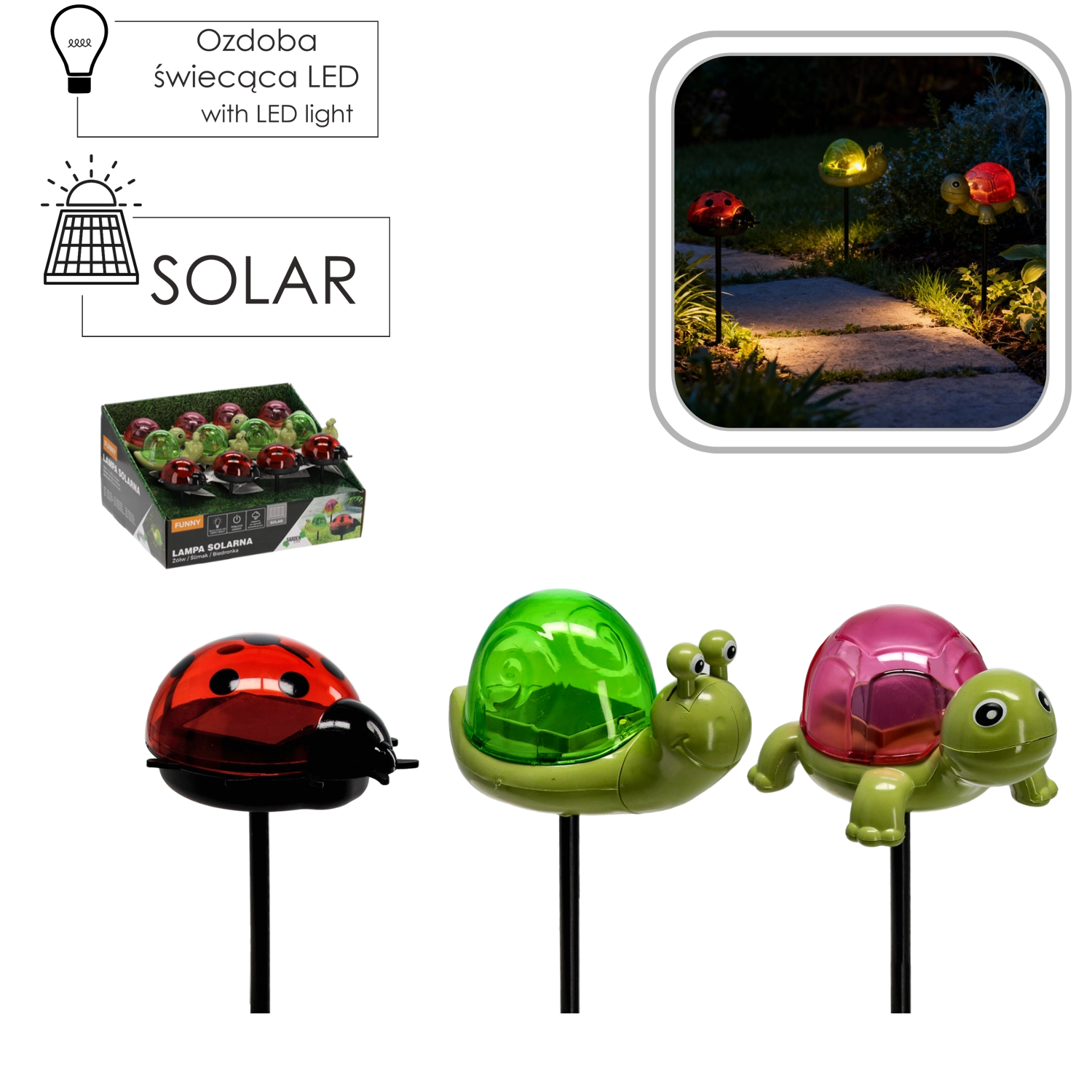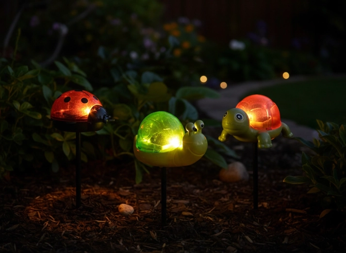 Broasca țestoasă, melcul și buburuza, cu „carapace”/cochilii colorate semitransparente, oferă fiecărei plantări un accent vesel și o luminează discret seara cu o lumină caldă.