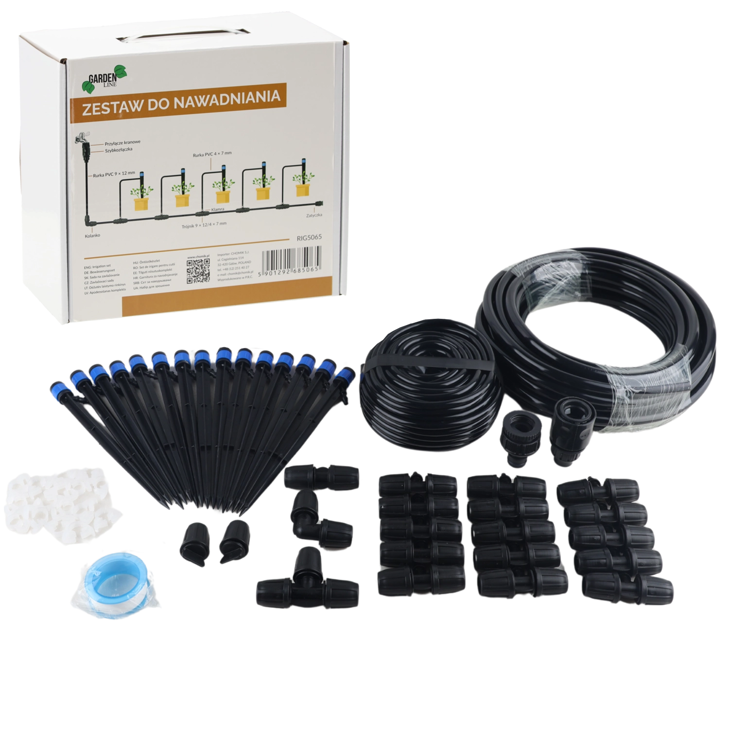Tot ce ai nevoie într-o singură cutie: picurători, furtunuri, cuple, piese T, capete de închidere și bandă PTFE. Montezi și pornești în câteva clipe.